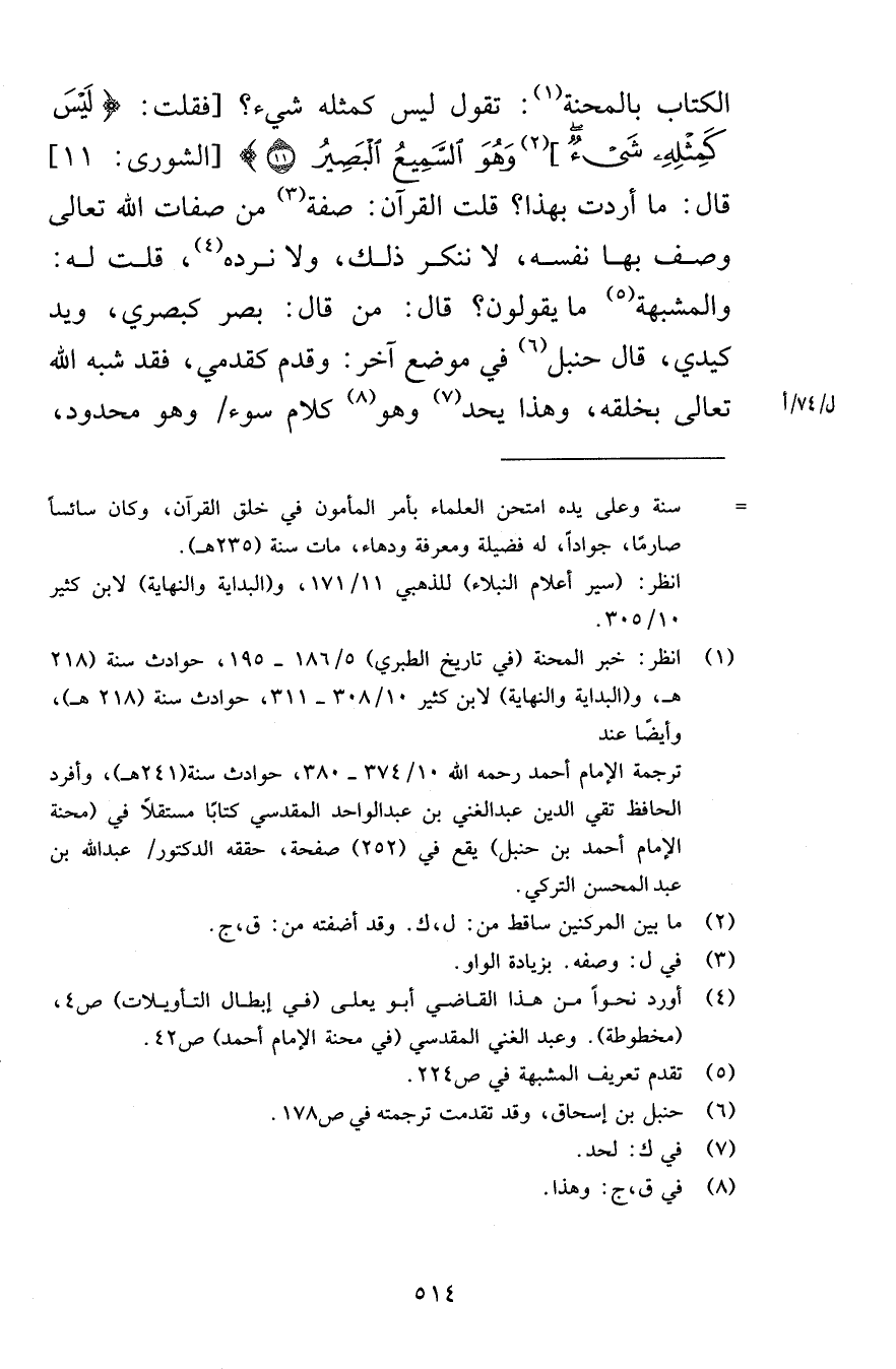 الكتاب بالمحنة تقول ليس كمثله شيء فقلت لَيْسَ كَمِثْلِهِ شَيْءٌ وَهُوَ السَّمِيعُ الْبَصِيرُ (11) [الشورى 11] قال ما أردت بهذا قلت القرآن صفة من صفات الله تعالى وصف بها نفسه لا ننكر ذلك ولا نرده قلت له والمشبهة ما يقولون قال من قال بصر كبصري ويد كيدي قال حنبل في موضع آخر وقدم كقدمي فقد شبه الله تعالى بخلقه وهذا يحد وهو كلام سوء وهو محدود