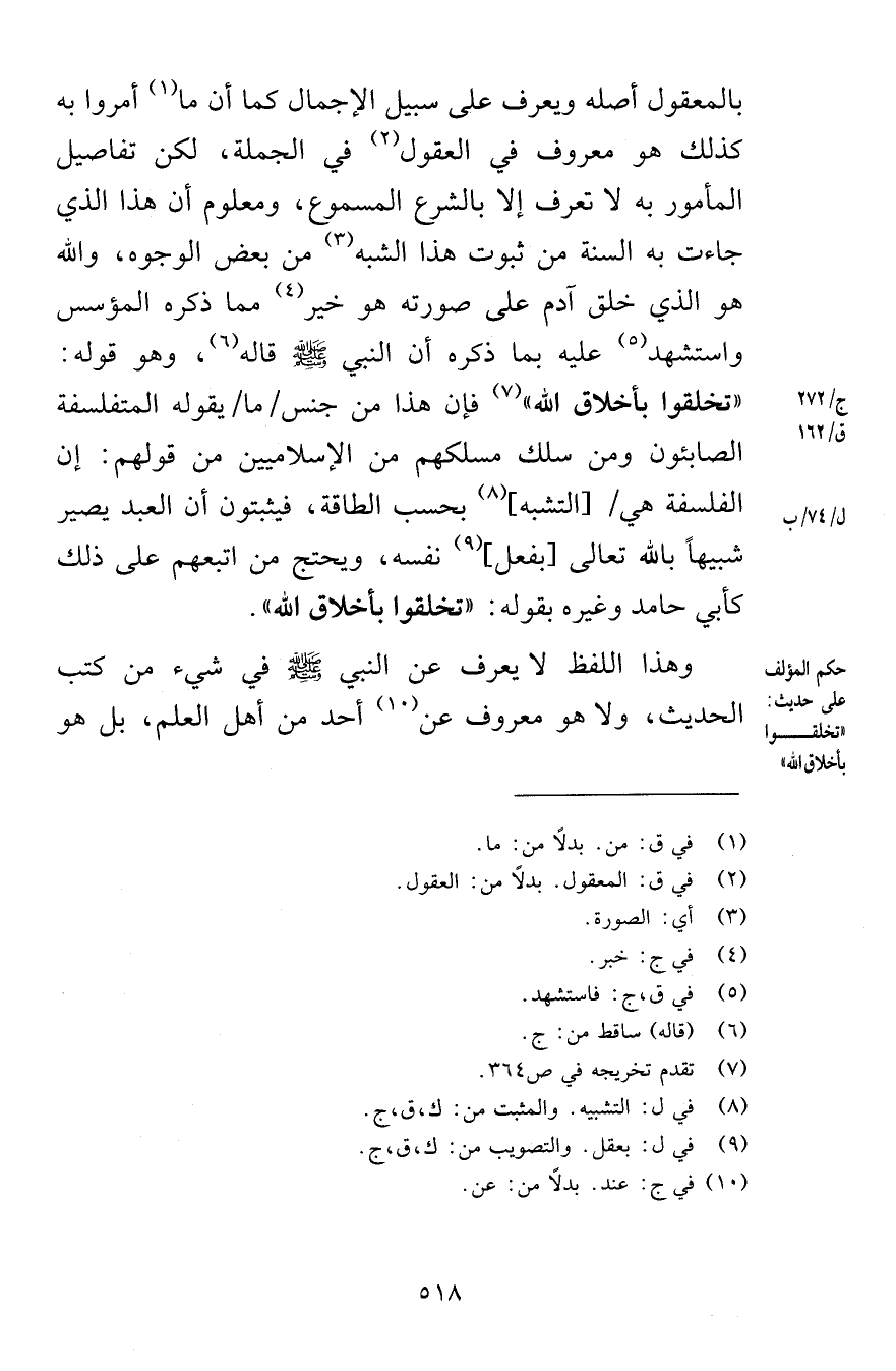 بالمعقول أصله ويعرف على سبيل الإجمال كما أن ما أمروا به كذلك هو معروف في العقول في الجملة لكن تفاصيل المأمور به لا تعرف إلا بالشرع المسموع ومعلوم أن هذا الذي جاءت به السنة من ثبوت هذا الشبه من بعض الوجوه والله هو الذي خلق آدم على صورته هو خير مما ذكره المؤسس واستشهد عليه بما ذكره أن النبي صلى الله عليه وسلم قاله وهو قوله تخلقوا بأخلاق الله فإن هذا من جنس ما يقوله المتفلسفة الصابئون ومن سلك مسلكهم من الإسلاميين من قولهم إن الفلسفة هي التشبه بحسب الطاقة فيثبتون أن العبد يصير شبيهاً بالله تعالى بفعل نفسه ويحتج من اتبعهم على ذلك كأبي حامد وغيره بقوله تخلقوا بأخلاق الله وهذا اللفظ لا يعرف عن النبي صلى الله عليه وسلم في شيء من كتب الحديث ولا هو معروف عن أحد من أهل العلم بل هو
