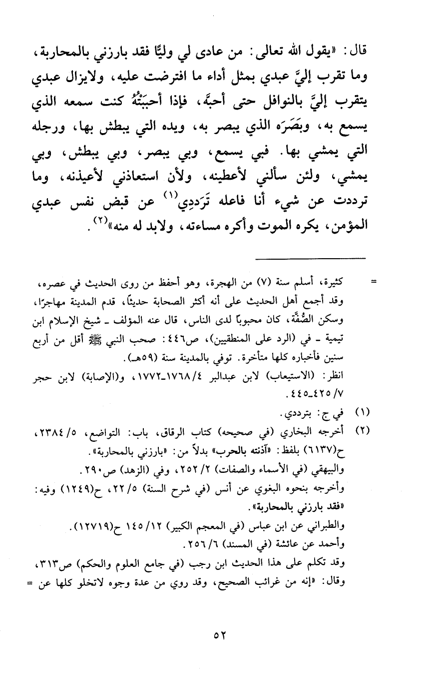 قال يقول الله تعالى من عادى لي وليًّا فقد بارزني بالمحاربة وما تقرب إليَّ عبدي بمثل أداء ما افترضت عليه ولايزال عبدي يتقرب إليَّ بالنوافل حتى أحبَّه فإذا أحبَبْتُهُ كنت سمعه الذي يسمع به وبَصَرَه الذي يبصر به ويده التي يبطش بها ورجله التي يمشي بها فبي يسمع وبي يبصر وبي يبطش وبي يمشي ولئن سألني لأعطينه ولأن استعاذني لأعيذنه وما ترددت عن شيء أنا فاعله تَرَددِي عن قبض نفس عبدي المؤمن يكره الموت وأكره مساءته ولابد له منه