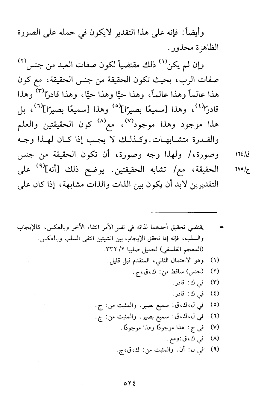 وأيضاً فإنه على هذا التقدير لا يكون في جمله على الصورة الظاهرة محذور وإن لم يكن ذلك مقتضياً لكون صفات العبد من جنس صفات الرب بحيث تكون الحقيقة من جنس الحقيقة مع كون هذا عالماً وهذا عالماً وهذا حيًّا وهذا حيًّا وهذا قادرًا وهذا قادرًا وهذا سميعًا بصيرًا وهذا سميعًا بصيرًا بل هذا موجود وهذا موجود مع كون الحقيقتين والعلم والقدرة متشابهات وكذلك لا يجب إذا كان لهذا وجه وصورة ولهذا وجه وصورة أن تكون الحقيقة من جنس الحقيقة مع تشابه الحقيقتين يوضح ذلك أنه على التقديرين لابد أن يكون بين الذات والذات مشابهة إذا كان على