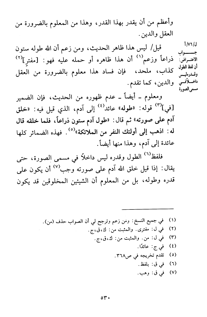 وأعظم من أن يقدر بهذا القدر وهذا من المعلوم بالضرورة من العقل والدين قيل ليس هذا ظاهر الحديث ومن زعم أن الله طوله ستون ذراعاً وزعم أن هذا ظاهره أو حمله عليه فهو مفترٍ كذاب ملحد فإن فساد هذا معلوم بالضرورة من العقل والدين كما تقدم ومعلوم أيضاً عدم ظهوره من الحديث فإن الضمير في قوله طوله عائد إلى آدم الذي قيل فيه خلق آدم على صورته ثم قال طول آدم ستون ذراعاً فلما خلقه قال له اذهب إلى أولئك النفر من الملائكة فهذه الضمائر كلها عائدة إلى آدم وهذا منها أيضاً فلفظ الطول وقدره ليس داخلاً في مسمى الصورة حتى يقال إذا قيل خلق الله آدم على صورته وجب أن يكون على قدره وطوله بل من المعلوم أن الشيئين المخلوقين قد يكون