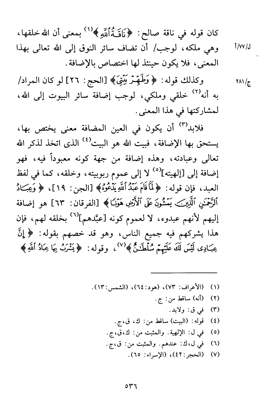 كان قوله في ناقة صالح نَاقَةَ اللَّهِ بمعنى أن الله خلقها وهي ملكه لوجب أن تضاف سائر النوق إلى الله تعالى بهذا المعنى فلا يكون حينئذ لها اختصاص بالإضافة وكذلك قوله وَطَهِّرْ بَيْتِيَ [الحج 26] لو كان المراد به أنه خلقي وملكي لوجب إضافة سائر البيوت إلى الله لمشاركتها في هذا المعنى فلابد أن يكون في العين المضافة معنى يختص بها يستحق بها الإضافة فبيت الله هو البيت الذي اتخذ لذكر الله تعالى وعبادته وهذه إضافة من جهة كونه معبوداً فيه فهو إضافة إلى إلهيته لا إلى عموم ربوبيته وخلقه كما في لفظ العبد فإن قوله لَمَّا قَامَ عَبْدُ اللَّهِ يَدْعُوهُ [الجن 19] وَعِبَادُ الرَّحْمَنِ الَّذِينَ يَمْشُونَ عَلَى الْأَرْضِ هَوْنًا [الفرقان 63] هو إضافة إليهم لأنهم عبدوه لا لعموم كونه عبَّدهم بخلقه لهم فإن هذا يشركهم فيه جميع الناس وهو قد خصهم بقوله إِنَّ عِبَادِي لَيْسَ لَكَ عَلَيْهِمْ سُلْطَانٌ وقوله عَيْنًا يَشْرَبُ بِهَا عِبَادُ اللَّهِ