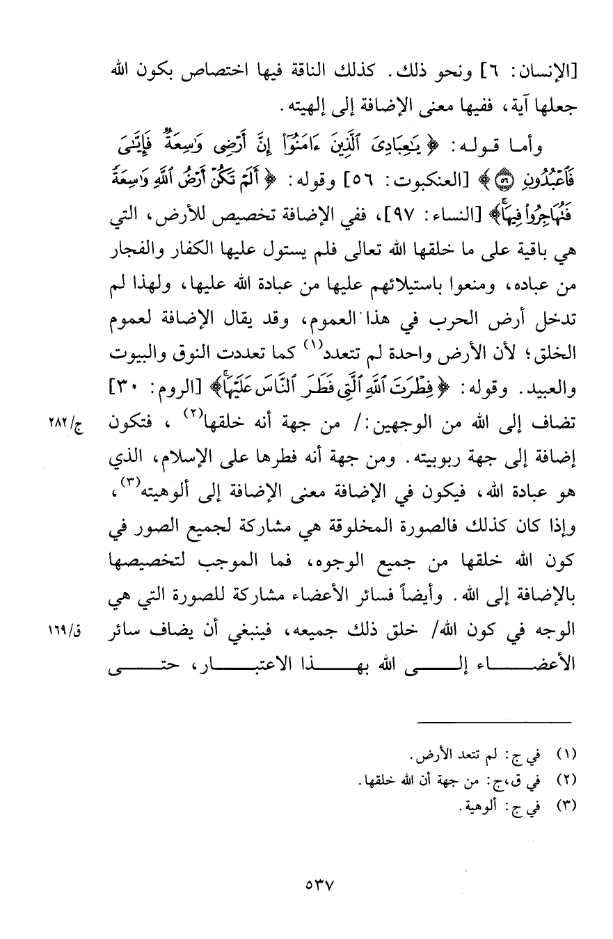[الإنسان 6] ونحو ذلك كذلك الناقة فيها اختصاص بكون الله جعلها آية ففيها معنى الإضافة إلى إلهيته وأما قوله يَا عِبَادِيَ الَّذِينَ آمَنُوا إِنَّ أَرْضِي وَاسِعَةٌ فَإِيَّايَ فَاعْبُدُونِ (56) [العنكبوت 56] وقوله أَلَمْ تَكُنْ أَرْضُ اللَّهِ وَاسِعَةً فَتُهَاجِرُوا فِيهَا [النساء 97] ففي الإضافة تخصيص للأرض التي هي باقية على ما خلقها الله تعالى فلم يستول عليها الكفار والفجار من عباده ومنعوا باستيلائهم عليها من عبادة الله عليها ولهذا لم تدخل أرض الحرب في هذا العموم وقد يقال الإضافة لعموم الخلق لأن الأرض واحدة لم تتعدد كما تعددت النوق والبيوت والعبيد وقوله فِطْرَتَ اللَّهِ الَّتِي فَطَرَ النَّاسَ عَلَيْهَا [الروم 30] تضاف إلى الله من الوجهين من جهة انه خلقها فتكون إضافة إلى جهة ربوبيته ومن جهة أنه فطرها على الإسلام الذي هو عبادة الله فيكون في الإضافة معنى الإضافة إلى ألوهيته وإذا كان كذلك فالصورة المخلوقة هي مشاركة لجميع الصور في كون الله خلقها من جميع الوجوه فما الموجب لتخصيصها بالإضافة إلى الله وأيضاً فسائر الأعضاء مشاركة للصورة التي هي الوجه في كون الله خلق ذلك جميعه فينبغي أن يضاف سائر الأعضاء إلى الله بهذا الاعتبار حتى