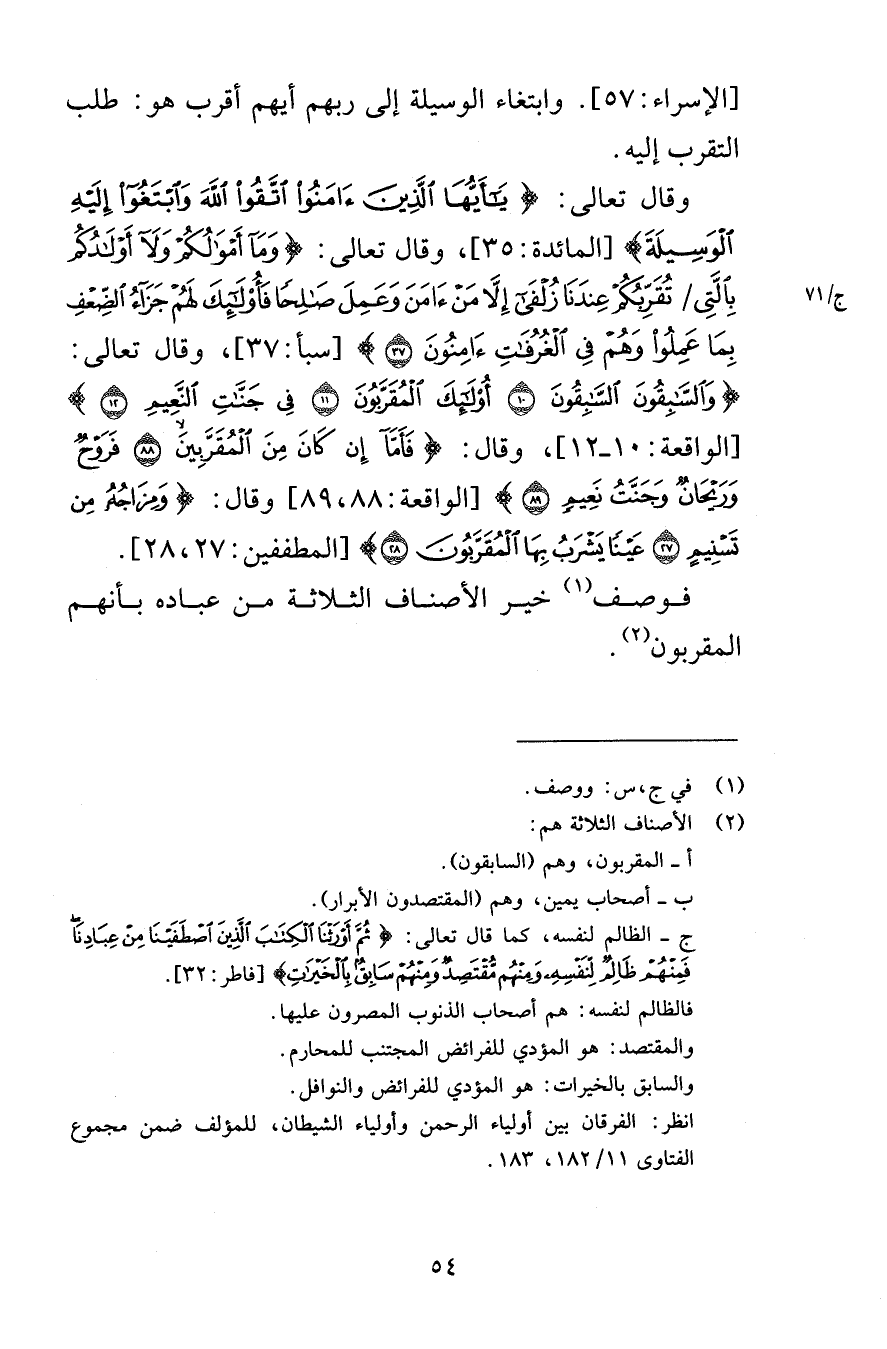 [الإسراء 57] وابتغاء الوسيلة إلى ربهم أيهم اقرب هو طلب التقرب إليه وقال تعالى يَا أَيُّهَا الَّذِينَ آمَنُوا اتَّقُوا اللَّهَ وَابْتَغُوا إِلَيْهِ الْوَسِيلَةَ [المائدة 35] وقال تعالى وَمَا أَمْوَالُكُمْ وَلَا أَوْلَادُكُمْ بِالَّتِي تُقَرِّبُكُمْ عِنْدَنَا زُلْفَى إِلَّا مَنْ آمَنَ وَعَمِلَ صَالِحًا فَأُولَئِكَ لَهُمْ جَزَاءُ الضِّعْفِ بِمَا عَمِلُوا وَهُمْ فِي الْغُرُفَاتِ آمِنُونَ (37) [سبأ 37] وقال تعالى وَالسَّابِقُونَ السَّابِقُونَ (10) أُولَئِكَ الْمُقَرَّبُونَ (11) فِي جَنَّاتِ النَّعِيمِ (12) [الواقعة 10-12] وقال فَأَمَّا إِنْ كَانَ مِنَ الْمُقَرَّبِينَ (88) فَرَوْحٌ وَرَيْحَانٌ وَجَنَّتُ نَعِيمٍ (89) [الواقعة 88-89] وقال وَمِزَاجُهُ مِنْ تَسْنِيمٍ (27) عَيْنًا يَشْرَبُ بِهَا الْمُقَرَّبُونَ (28) [المطففين 27-28] فوصف خير الأصناف الثلاثة من عباده بأنهم المقربون
