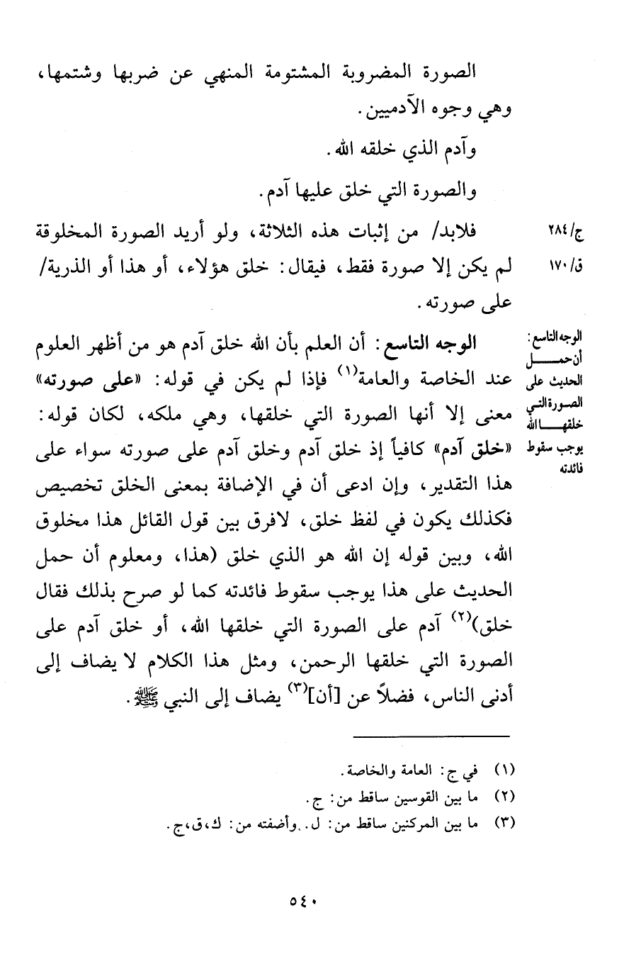الصورة المضروبة المشتومة المنهي عن ضربها وشتمها وهي وجوه الآدميين وآدم الذي خلقه الله والصورة التي خلق عليها آدم فلابد من إثبات هذه الثلاثة ولو أريد الصورة المخلوقة لم يكن إلا صورة فقط فيقال خلق هؤلاء أو هذا أو الذرية على صورته الوجه التاسع أن العلم بأن الله خلق آدم هو من أظهر العلوم عند الخاصة والعامة فإذا لم يكن في قوله على صورته معنى إلا أنها الصورة التي خلقها وهي ملكه لكان قوله خلق آدم كافياً إذ خلق آدم وخلق آدم على صورته سواء على هذا التقدير وإن ادعى أن في الإضافة بمعنى الخلق تخصيص فكذلك يكون في لفظ خلق لا فرق بين قول القائل هذا مخلوق الله وبين قوله إن الله هو الذي خلق هذا ومعلوم أن حمل الحديث على هذا يوجب سقوط فائدته كما لو صرح بذلك فقال خلق آدم على الصورة التي خلقها الله أو خلق آدم على الصورة التي خلقها الرحمن ومثل هذا الكلام لا يضاف إلى أدنى الناس فضلاً عن أن يضاف إلى النبي صلى الله عليه وسلم