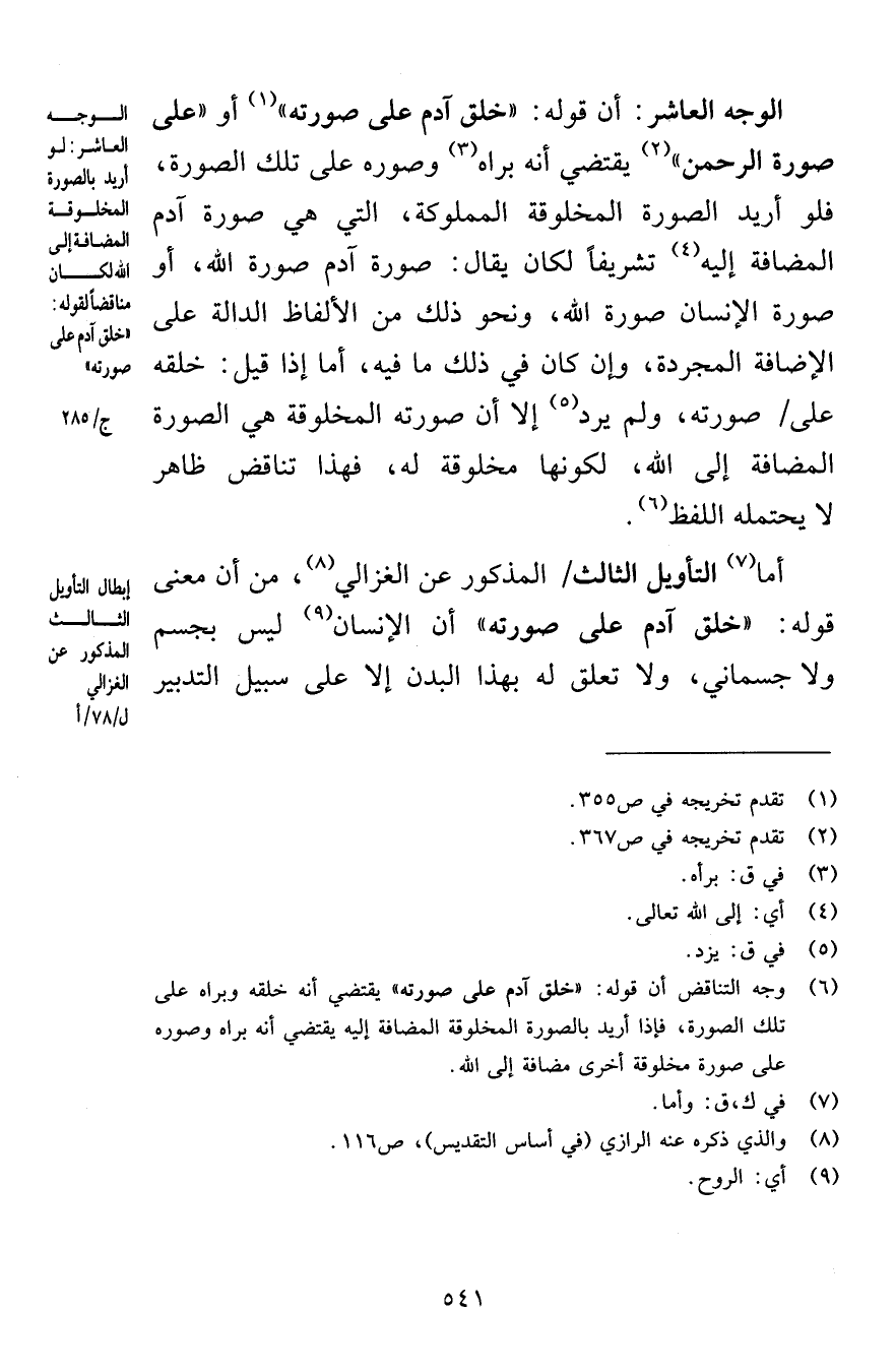 الوجه العاشر أن قوله خلق آدم على صورته أو على صورة الرحمن يقتضي أنه براه وصوره على تلك الصورة فلو أريد الصورة المخلوقة المملوكة التي هي صورة آدم المضافة إليه تشريفاً لكان قال صورة آدم صورة الله أو صورة الإنسان صورة الله ونحو ذلك من الألفاظ الدالة على الإضافة المجردة وإن كان في ذلك ما فيه أما إذا قيل خلقه على صورته ولم يرد إلا أن صورته المخلوقة هي الصورة المضافة إلى الله لكونها مخلوقة له فهذا تناقض ظاهر لا يحتمله اللفظ أما التأويل الثالث المذكور عن الغزالي من أن معنى قوله خلق آدم على صورته أن الإنسان ليس بجسم ولا جسماني ولا تعلق له بهذا البدن إلا على سبيل التدبير