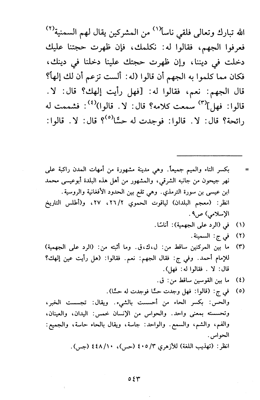 الله تبارك وتعالى فلقي أناساً من المشركين يقال لهم السمنية فعرفوا الجهم فقالوا له نكلمك فإن ظهرت حجتنا عليك دخلت في ديننا وإن ظهرت حجتنا عليك دخلنا في دينك فكان مما كلموا به الجهم أن قالوا له ألست تزعم أن لك إلهاً قال الجهم نعم فقالوا له فهل رأيت إلهك فقال لا قالوا فهل سمعت كلامه قال لا قالوا فشممت له رائحة قالا لا قالوا فوجدت له حسًّا قال لا قالوا