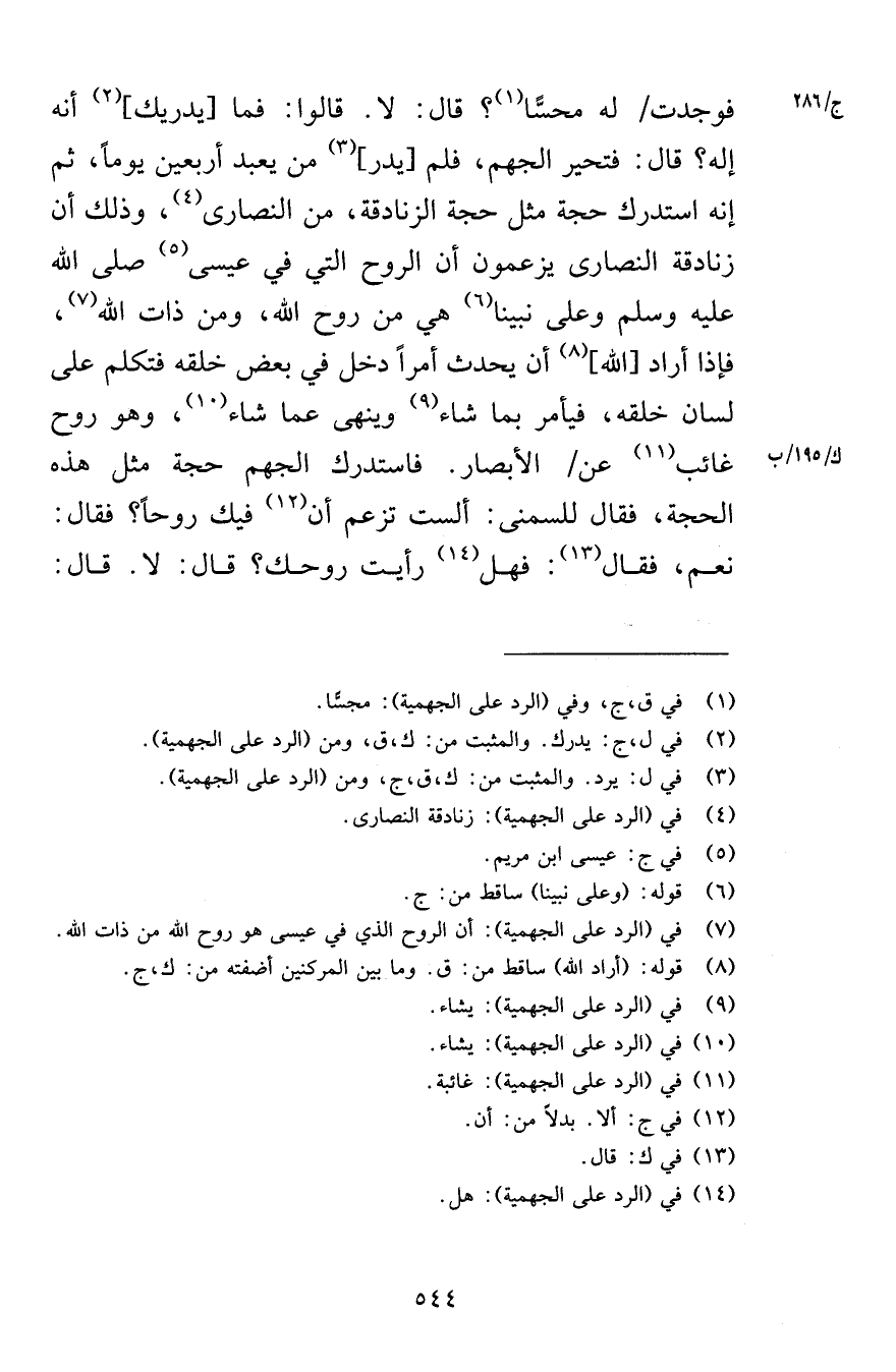 فوجدت له محسًّا قال لا قالوا فما يدريك أنه إله قال فتحير الجهم فلم يدر من يعبد أربعين يوماً ثم إنه استدرك حجة مثل حجة الزنادقة من النصارى وذلك أن زنادقة النصارى يزعمون، الروح التي في عيسى صلى الله عليه وسلم وعلى نبينا هي من روح الله ومن ذات الله فإذا أراد الله أن يحدث أمراً دخل في بعض خلقه فتكلم على لسان خلقه فيأمر بما شاء وينهى عما شاء وهو روح غائب عن الأبصار فاستدرك الجهم حجة مثل هذه الحجة فقال للسمنى ألست تزعم أن فيك روحاً فقال نعه فقال هل رأيت روحك قال لا قال
