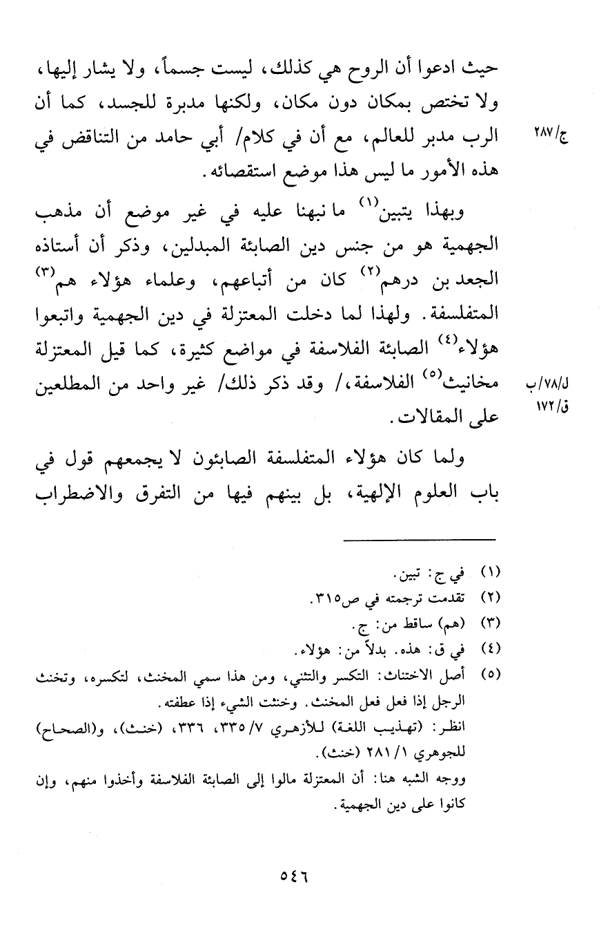 حيث ادعوا أن الروح هي كذلك ليست جسماً ولا يشار إليها ولا تختص بمكان دون مكان ولكنها مدبرة للجسد كما أن الرب مدبر للعالم مع أن في كلام أبي حامد من التناقض في هذه الأمور ما ليس هذا موضع استقصائه وبهذا يتبين ما نبهنا عليه في غير موضع أن مذهب الجهمية هو من جنس دين الصابئة المبدلين وذكر أن أستاذه الجهد بن درهم كان من أتباعهم وعلماء هؤلاء هم المتفلسفة ولهذا لما دخلت المعتزلة في دين الجهمية واتبعوا هؤلاء الصابئة الفلاسفة في مواضع كثيرة كما قيل المعتزلة مخانيث الفلاسفة وقد ذكر ذلك غير واحد من المطلعين على المقالات ولما كان هؤلاء المتفلسفة الصابئون لا يجمعهم قول في باب العلوم الإلهية بل بينهم فيها من التفرق الاضطراب