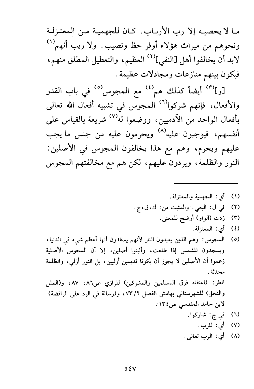 ما لا يحصيه إلا رب الأرباب كان للجهمية من المعتزلة ونحوهم من ميراث هؤلاء أوفر حظ ونصيب ور ريب أنهم لابد أن يخالفوا أهل النفي العظيم والتعطيل المطلق منهم فيكون بينهم منازعات ومجادلات عظيمة وأيضاً كذلك هم مع المجوس في باب القدر والأفعال فإنهم شركوا المجوس في تشبيه أفعال الله تعالى بأفعال الواحد من الآدميين ووضعوا له شريعة بالقياس على أنفسهم فيوجبون عليه ويحرمون عليه من جنس ما يوجب عليهم ويحرم وهم مع هذا يخالفونه المجوس في الأصلين النور والظلمة ويردون عليهم لكن هم مع مخالفتهم المجوس