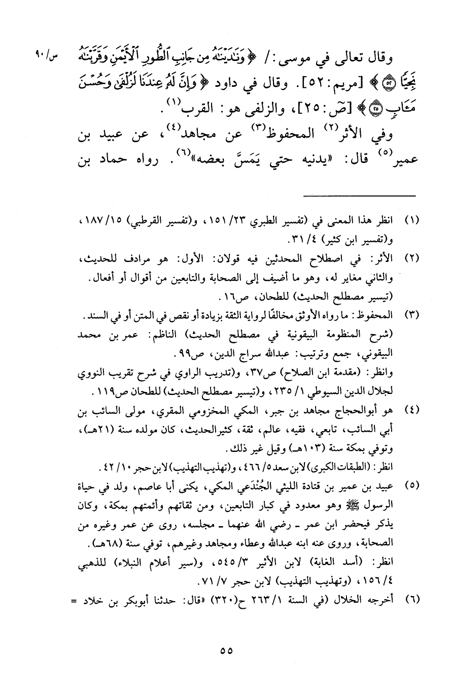 وقال تعالى في موسى وَنَادَيْنَاهُ مِنْ جَانِبِ الطُّورِ الْأَيْمَنِ وَقَرَّبْنَاهُ نَجِيًّا (52) [مريم 52] وقال في داود وَإِنَّ لَهُ عِنْدَنَا لَزُلْفَى وَحُسْنَ مَآبٍ (25) [ص 25] والزلفى هو القرب وفي الأثر المحفوظ عن مجاهد عن عبيد بن عمير قال يدنيه حتى يَمَسَّ بعضه رواه حماد بن