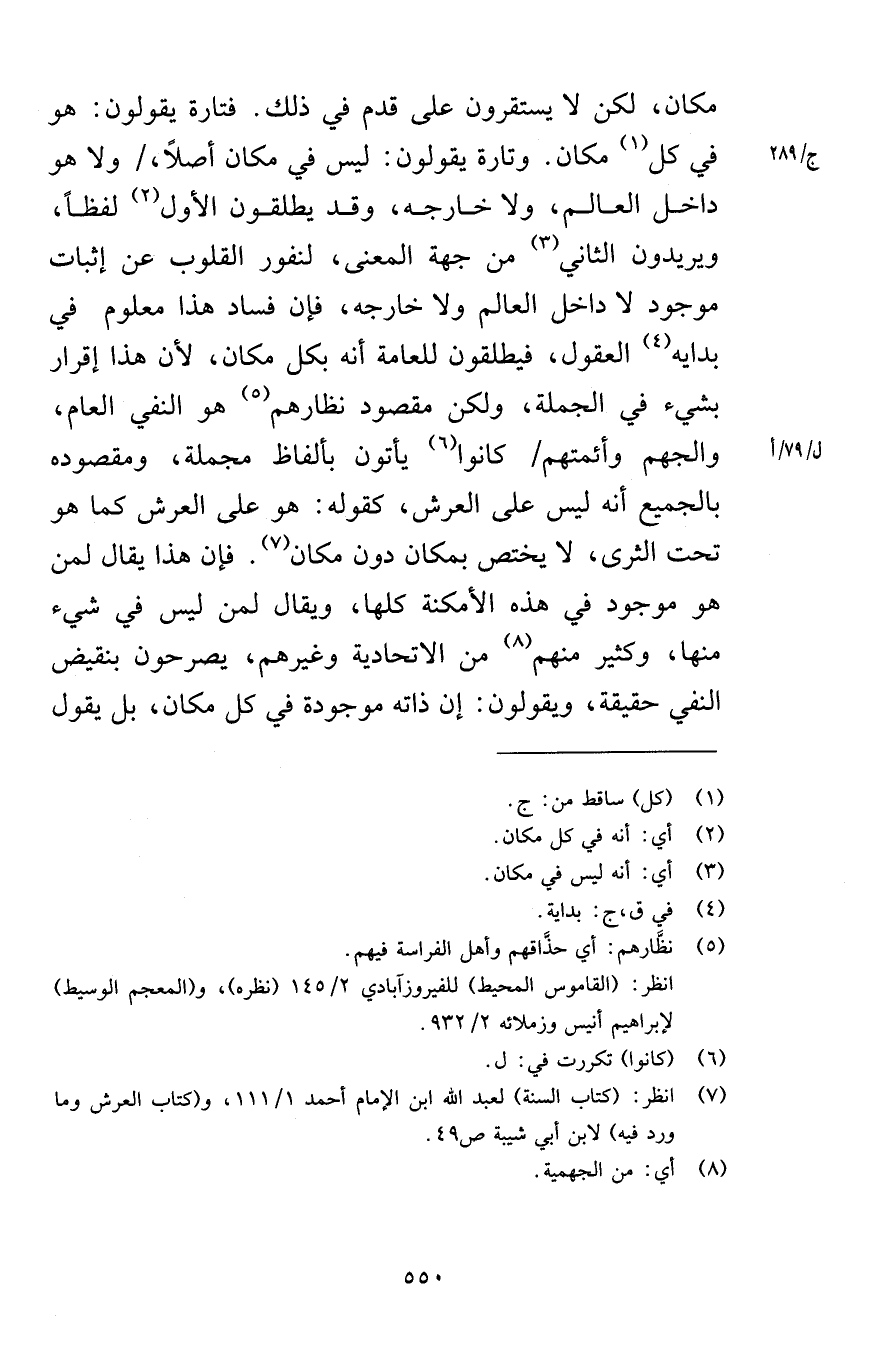مكان لا يستقرون على قدم في ذلك فتارة يقولون هو في كل مكان وتارة يقولون ليس في مكان أصلاً ولا هو داخل العالم ولا خارجه وقد يطلقون الأول لفظاً ويريدون الثاني من جهة المعنى لنفور القلوب عن إثبات موجود لا داخل العالم ولا خارجه فإن فساد هذا معلوم في بداية العقول فيطلقون للعامة انه بكل مكان لأن هذا إقرار بشيء من الجملة ولكن مقصود نظارهم هو النفي العام والجهم وأئمتهم كانوا يأتون بألفاظ مجملة ومقصوده بالجميع انه ليس على العرش كقوله هو على العرش كما تحت الثرى لا يختص بمكان دون مكان فإن هذا يقال لمن هو موجود في هذه الأمكنة كلها ويقال لمن ليس في شيء منها وكثير منهم من الاتحادية وغيرهم يصرحون بنقيض النفي حقيقة ويقولون إن ذاته موجودة في كل مكان بل يقولون