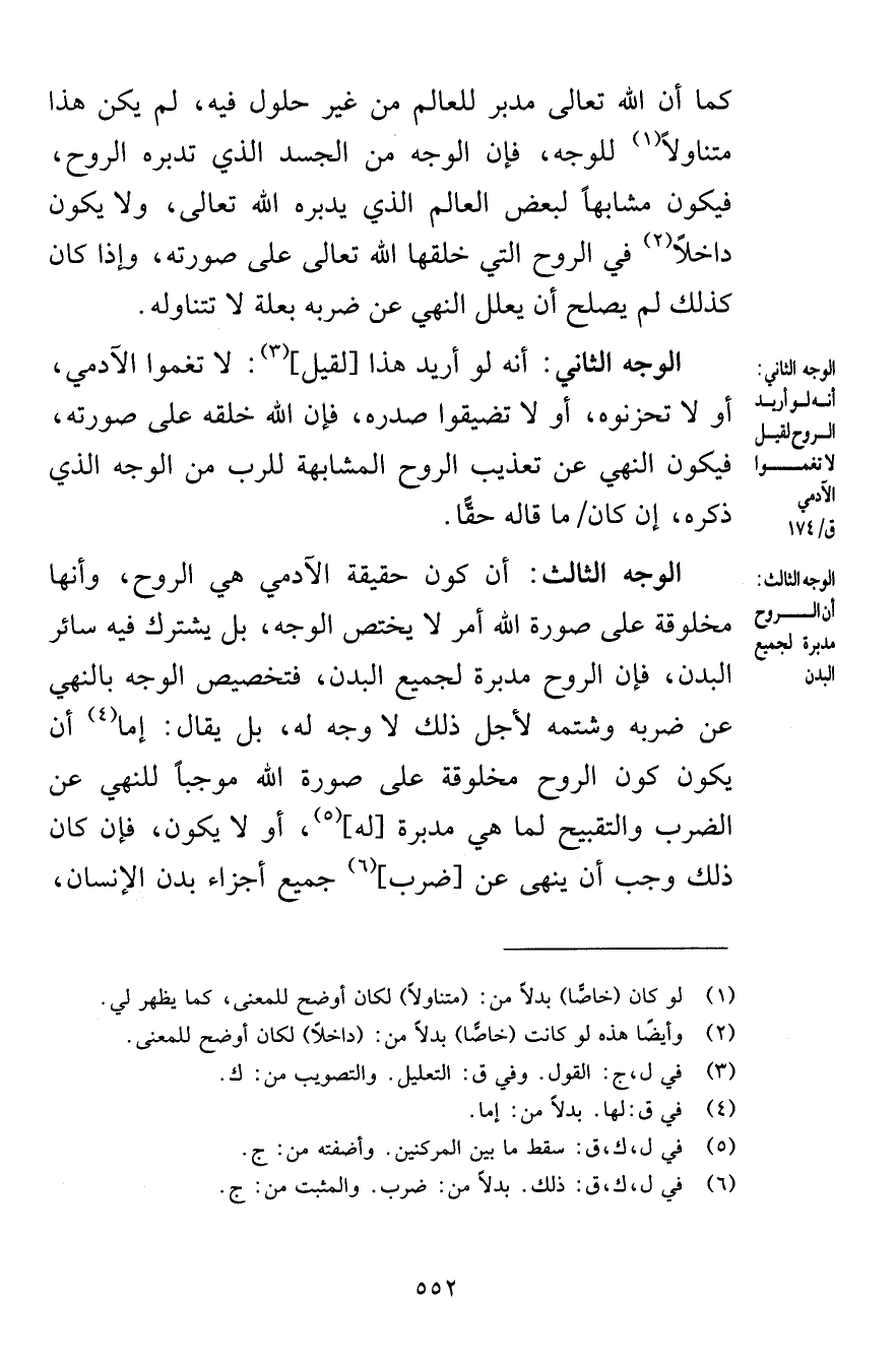 كما أن الله تعالى مدبر للعالم من غير حلول فيه لم يكن هذا متناولاً للوجه فإن الوجه من الجسد الذي تدبره الروح فيكون مشابهاً لبعض العالم الذي يدبره الله تعالى ولا يكون داخلاً في الروح التي خلقها الله تعالى على صورته وإذا كان كذلك لم يصلح أن يعلل النهي عن ضربه بعلة لا تتناوله الوجه الثاني أنه لو أريد هذا لقيل لا تغموا الآدمي أو لا تحزنوه أو لا تضيقوا صدره فإن الله خلقه على صورته فيكون النهي عن تعذيب الروح المشابهة للرب من الوجه الذي ذكره إن كان ما قاله حقًّا الوجه الثالث أن كون حقيقة الآدمي هي الروح وأنها مخلوقة على صورة الله أمر لا يختص الوجه بل يشترك فيه سائر البدن فإن الروح مدبرة لجميع البدن فتخصيص الوجه بالنهي عن ضربه وشتمه لأجل ذلك لا وجه له بل يقال إما أن يكون كون الروح مخلوقة على صورة الله موجباً للنهي عن الضرب والتقبيح لما هي مدبرة له أو لا يكون فإن كان ذلك وجب أن ينهى عن ضرب جميع أجزاء بدن الإنسان