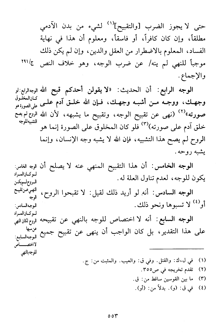 حتى لا يجوز الضرب والتقبيح لشيء من بدن الآدمي مطلقاً وإن كان كافراً أو فاسقاً ومعلوم أن هذا في نهاية الفساد المعلوم بالاضطرار من العقل والدين وإن لم يكن ذلك موجباً للنهي لم ينه عن ضرب الوجه وهو خلاف النص والإجماع الوجه الرابع أن الحديث لا يقولن أحدكم قبح الله وجهك ووجه من أشبه وجهك فإن الله خلق آدم على صورته نهى عن تقبيح الوجه وتقبيح ما يشبهه لأن الله خلق آدم على صورته فلو كلن المخلوق على الصورة إنما هو الروح لم يصح هذا التشبيه فإن الله لا يشبه وجه الإنسان وإنما يشبه روحه الوجه الخامس أن هذا التقبيح المنهي عنه لا يصلح أن يكون للوجه لعدم تناول العلة له الوجه السادس أنه لو أريد ذلك لقيل لا تقبحوا الروح أو لا تسبوها ونحو ذلك الوجه السابع أنه لا اختصاص للوجه بالنهي عن تقبيحه على هذا التقدير بل كان الواجب أن ينهى عن تقبيح جميع