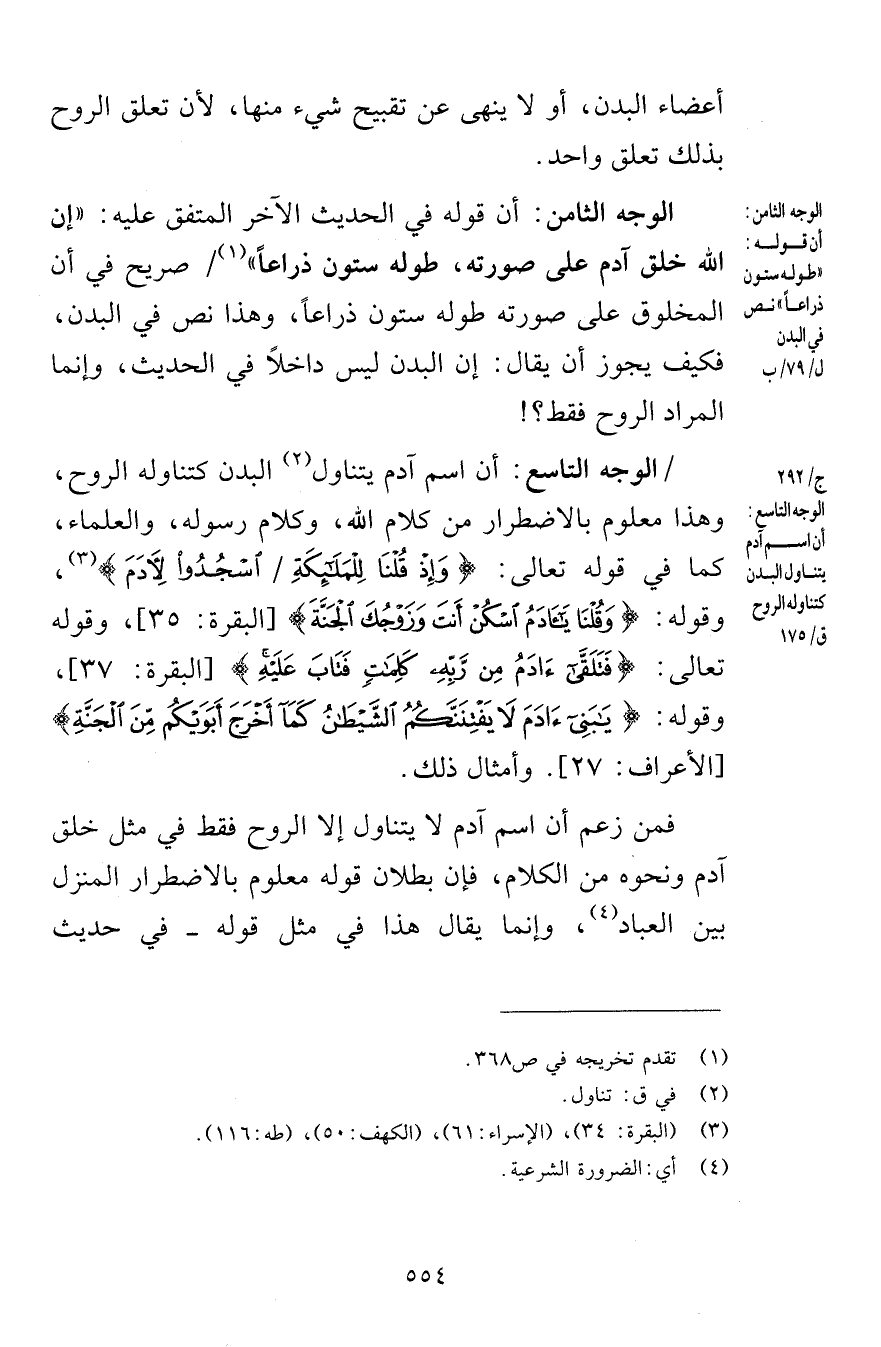 أعضاء البدن أو لا ينهى عن تقبيح شيء منها لأن تعلق الروح بذلك تعلق واحد الوجه الثامن أن قوله في الحديث الآخر المتفق عليه إن الله خلق آدم على صورته طوله ستون ذراعاً صريح في أن المخلوق على صورته طوله ستون ذراعاً وهذا نص في البدن فكيف يجوز أن يقال إن البدن ليس داخلاً في الحديث وإنما المراد الروح فقط الوجه التاسع أن اسم آدم يتناول البدن كتناوبه الروح وهذا معلوم بالاضطرار من كلام الله وكلام رسوله والعلماء كما في قوله تعالى وَإِذْ قُلْنَا لِلْمَلَائِكَةِ اسْجُدُوا لِآدَمَ وقوله وَقُلْنَا يَا آدَمُ اسْكُنْ أَنْتَ وَزَوْجُكَ الْجَنَّةَ [البقرة 35] وقوله تعالى فَتَلَقَّى آدَمُ مِنْ رَبِّهِ كَلِمَاتٍ فَتَابَ عَلَيْهِ [البقرة 37] وقوله يَا بَنِي آدَمَ لَا يَفْتِنَنَّكُمُ الشَّيْطَانُ كَمَا أَخْرَجَ أَبَوَيْكُمْ مِنَ الْجَنَّةِ [الأعراف 27] وأمثال ذلك فمن زعم أن اسم آدم لا يتناول إلا الروح فقط في مثل خلق آدم ونحوه من الكلام فإن بطلان قوله معلوم بالاضطرار المنزل بين العباد وإنما يقال هذا في مثل قوله في حديث