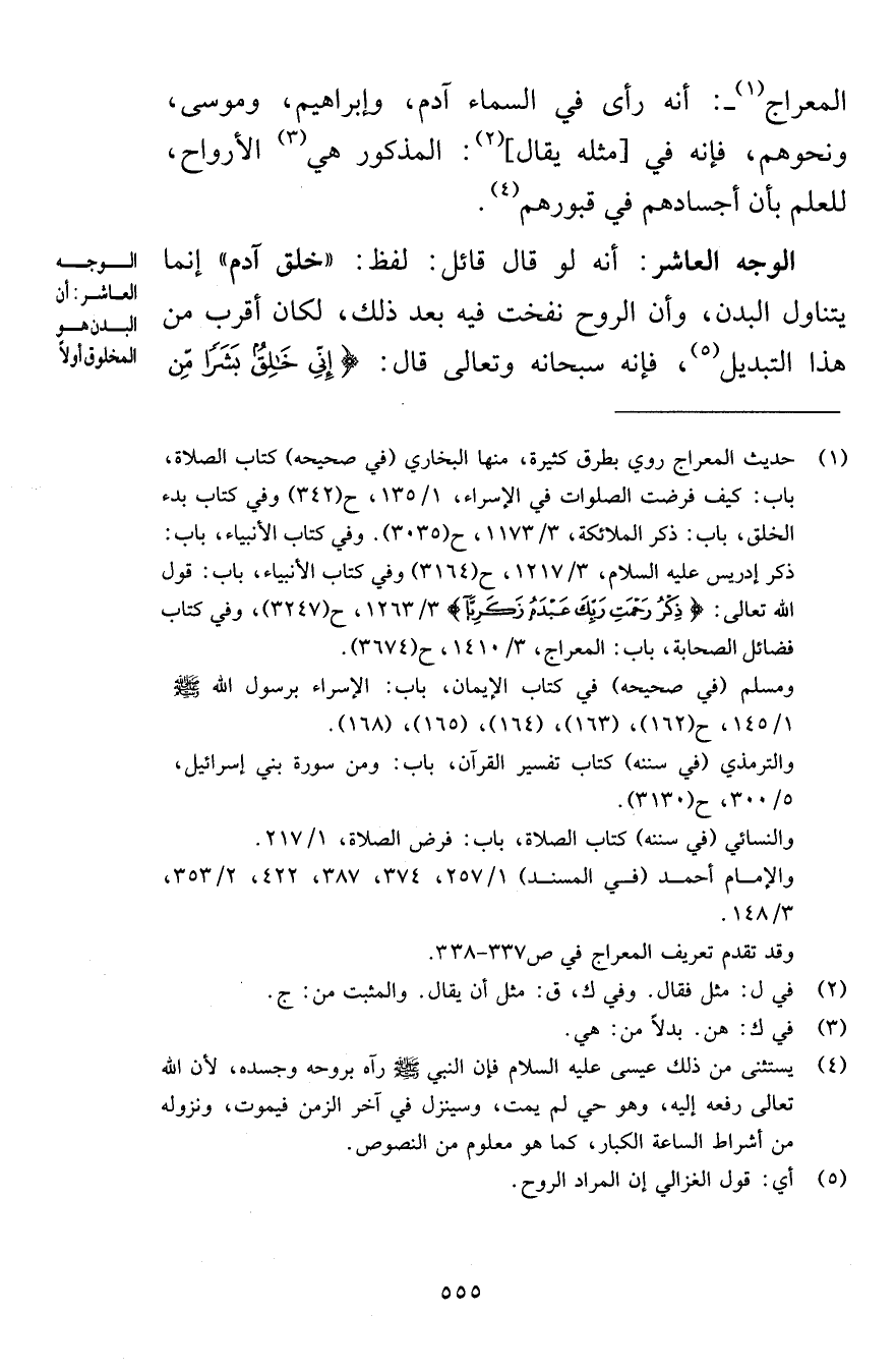 المعراج أنه رأى في السماء آدم وإبراهيم وموسى ونحوهم فإنه في مثله يقال المذكور هي الأرواح للعلم بأن أجسادهم في قبورهم الوجه العاشر أنه لو قال قائل لفظ خلق آدم إنما يتناول البدن وأن الروح نفخت فيه بعد ذلك لكان أقرب من هذا التبديل فإنه سبحانه وتعالى قال إِنِّي خَالِقٌ بَشَرًا مِنْ