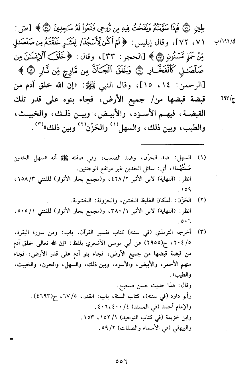 طِينٍ (71) فَإِذَا سَوَّيْتُهُ وَنَفَخْتُ فِيهِ مِنْ رُوحِي فَقَعُوا لَهُ سَاجِدِينَ (72) [ص 71-72] وقال إبليس لَمْ أَكُنْ لِأَسْجُدَ لِبَشَرٍ خَلَقْتَهُ مِنْ صَلْصَالٍ مِنْ حَمَإٍ مَسْنُونٍ (33) [الحجر 33] وقال خَلَقَ الْإِنْسَانَ مِنْ صَلْصَالٍ كَالْفَخَّارِ (14) وَخَلَقَ الْجَانَّ مِنْ مَارِجٍ مِنْ نَارٍ (15) [الرحمن 14-15] وقال النبي صلى الله عليه وسلم إن الله خلق آدم من قبضة قبضها من جميع الأرض فجاء بنوه على قدر تلك القبضة فيهم الأسود والأبيض وبين ذلك والخبيث والطيب وبين ذلك والسهل والحَزْن وبين ذلك
