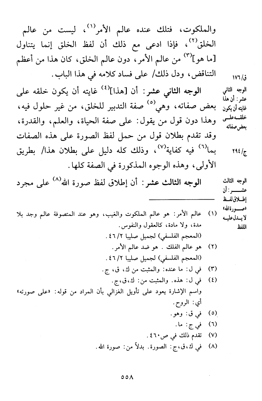 والملكوت فتلك عنده عالم الأمر ليست من عالم الخلق فإذا ادعى مع ذلك أن لفظ الخلق إنما يتناول ما هو من عالم الأمر دون عالم الخلق كان هذا من أعظم التناقض ودل ذلك على فساد كلامه في هذا الباب الوجه الثاني عشر أن هذا غايته أن يكون خلقه على بعض صفاته وهي صفة التدبير للخلق من غير حلول فيه وهذا دون قول من يقول على صفة الحياة والعلم والقدرة وقد تقدم بطلان قول من حمل لفظ الصورة على هذه الصفات بما فيه كفاية وذلك كله دليل على بطلان هذا بطريق الأولى وهذه الوجوه المذكورة في الصفة كلها الوجه الثالث عشر أن إطلاق لفظ صورة الله على مجرد