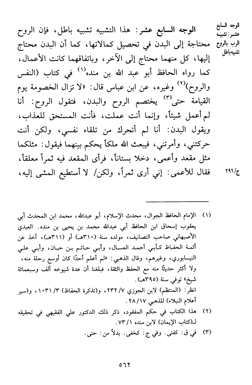 الوجه السابع عشر هذا التشبيه تشبيه باطل فإن الروح محتاجة إلى البدن في تحصيل كمالاتها كما أن البدن محتاج إليها كل منهما محتاج إلى الآخر وباتفاقهما كانت الأعمال كما رواه الحافظ أبو عبد الله بن منده في كتاب النفس والروح وغيره عن ابن عباس قال لا تزال الخصومة يوم القيامة حتى يختصم الروح والبدن فتقول الروح أنا لم أعمل شيئاً وإنما أنت عملت فأنت المستحق للعذاب ويقول البدن أنا لم أتحرك من تلقاء نفسي ولكن أنت حركتني وأمرتني فيبعث الله ملكاً يحكم بينهما فيقول مثلكما مثل مقعد وأعمى دخلا بستاناً فرأى المقعد فيه ثمراً معلقاً فقال للأعمى إني أرى ثمراً ولكن لا أستطيع المشي إليه