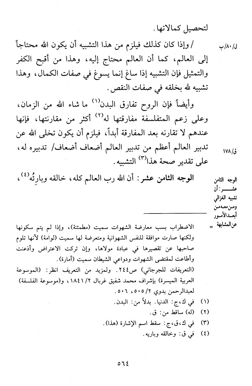لتحصيل كمالاتها وإذا كان كذلك فيلزم من هذا التشبيه أن يكون الله محتاجاً إلى العالم كما أن العالم محتاج إليه وهذا من أقبح الكفر والتمثيل فإن التشبيه إذا ساغ إنما يسوغ في صفات الكمال وهذا تشبيه لله بخلقه في صفات النقص وأيضاً فإن الروح تفارق البدن ما شاء الله من الزمان وعلى زعم المتفلسفة مفارقتها له أكثر من مقارنتها فإنها عندهم لا تقارنه بعد المفارقة أبداً فيلزم أن يكون تخلى الله عن تدبير العالم أعظم من تدبير العالم أضعاف أضعاف تدبيره له على تقدير صحة هذا التشبيه الوجه الثامن عشر أن الله رب العالم كله خالقه وبارِئُه
