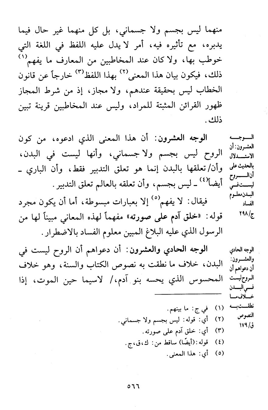 منهما ليس بجسم ولا جسماني بل كل منهما غير حال فيما يدبره مع تأثيره فيه أمر لا يدل عليه اللفظ في اللغة التي خوطب بها ولا كان عند المخاطبين من المعارف ما يفهم ذلك فيكون بيان هذا المعنى بهذا اللفظ خارجاً عن قانون الخطاب ليس بحقيقة عندهم ولا مجاز إذ من شرط المجاز ظهور القرائن المثبتة للمراد وليس عند المخاطبين قرينة تبين ذلك الوجه العشرون أن هذا المعنى الذي ادعوه من كون الروح ليس بجسم ولا جسماني وأنها ليست في البدن وأن تعلقها بالبدن إنما هو تعلق التدبير فقط وأن الباري أيضاً ليس بجسم وأن تعلقه بالعالم تعلق التدبير فيقال لا يفهم إلا بعبارات مبسوطة أما أن يكون مجرد قوله خلق آدم على صورته مفهماً لهذه المعاني مبيناً لها من الرسول الذي عليه البلاغ المبين معلوم الفساد بالاضطرار الوجه الحادي والعشرون أن دعواهم أن الروح ليست في البدن خلاف ما نطقت به نصوص الكتاب والسنة وهو خلاف المحسوس الذي يحسه بنو آدم لاسيما حين الموت إذا