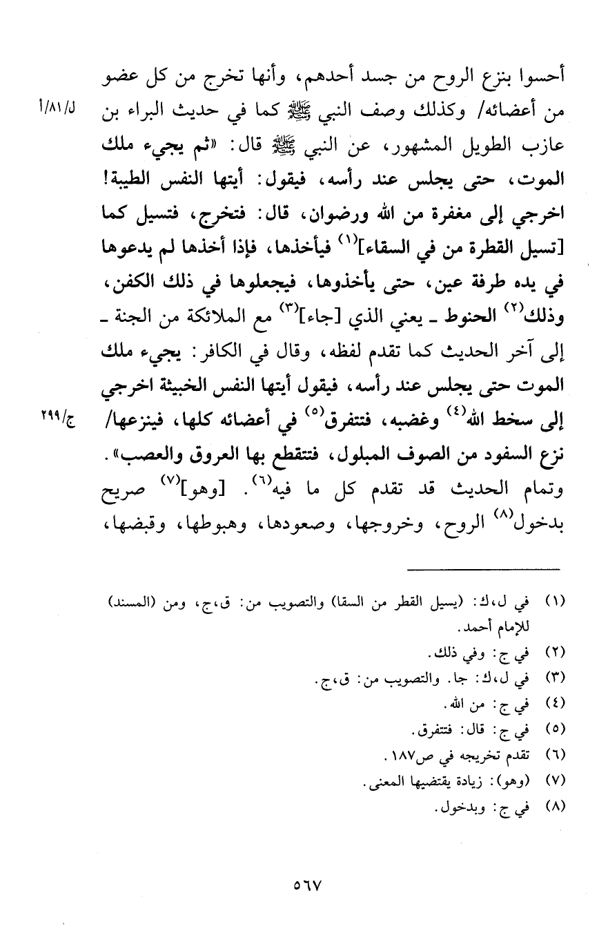 أحسوا بنزع الروح من جسد أحدهم وأنها تخرج من كل عضو من أعضائه وكذلك وصف النبي صلى الله عليه وسلم كما في حديث البراء بن عازب الطويل المشهور عن النبي صلى الله عليه وسلم قال ثم يجيء ملك الموت حتى يجلس عند رأسه فيقول أيتها النفس الطيبة اخرجي إلى مغفرة من الله ورضوان قال فتخرج فتسيل كما تسيل القطرة من في السقاء فيأخذها فإذا أخذها لم يدعوها في يده طرفة عين حتى يأخذوها فيجعلوها في ذلك الكفن وذلك الحنوط يعني الذي جاء مع الملائكة من الجنة إلى آخر الحديث كما تقدم لفظه وقال في الكافر يجيء ملك الموت حتى يجلس عند رأسه فيقول أيتها النفس الخبيثة اخرجي إلى سخط الله وغضبه فتتفرق في أعضاءه كلها فينزعها نزع السفود من الصوف المبلول فتتقطع بها العروق والعصب وتمام الحديث قد تقدم كلما فيه وهو صريح بدخول الروح وخروجها وصعودها وهبوطها وقبضها