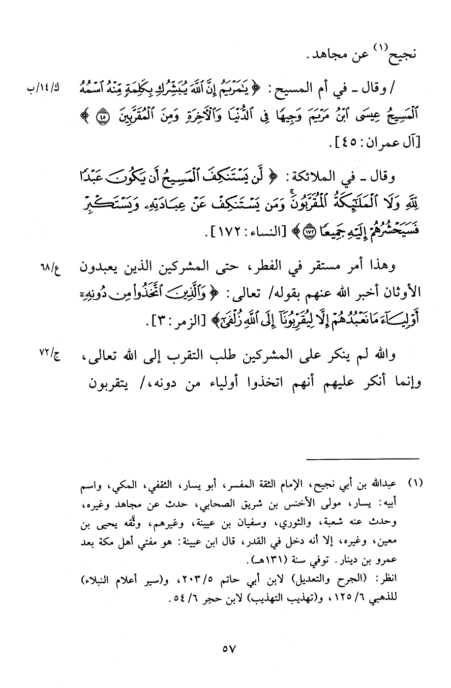 نجيح عن مجاهد وقال في أم المسيح يَا مَرْيَمُ إِنَّ اللَّهَ يُبَشِّرُكِ بِكَلِمَةٍ مِنْهُ اسْمُهُ الْمَسِيحُ عِيسَى ابْنُ مَرْيَمَ وَجِيهًا فِي الدُّنْيَا وَالْآخِرَةِ وَمِنَ الْمُقَرَّبِينَ (45) [آل عمران 45] وقال في الملائكة لَنْ يَسْتَنْكِفَ الْمَسِيحُ أَنْ يَكُونَ عَبْدًا لِلَّهِ وَلَا الْمَلَائِكَةُ الْمُقَرَّبُونَ وَمَنْ يَسْتَنْكِفْ عَنْ عِبَادَتِهِ وَيَسْتَكْبِرْ فَسَيَحْشُرُهُمْ إِلَيْهِ جَمِيعًا (172) [النساء 172] وهذا أمر مستقر في الفطر حتى المشركين الذين يعبدون الأوثان أخبر عنهم بقوله تعالى وَالَّذِينَ اتَّخَذُوا مِنْ دُونِهِ أَوْلِيَاءَ مَا نَعْبُدُهُمْ إِلَّا لِيُقَرِّبُونَا إِلَى اللَّهِ زُلْفَى [الزمر 3] والله لم ينكر على المشركين طلب التقرب إلى الله تعالى وإنما أنكر عليهم أنهم اتخذوا أولياء من دونه يتقربون