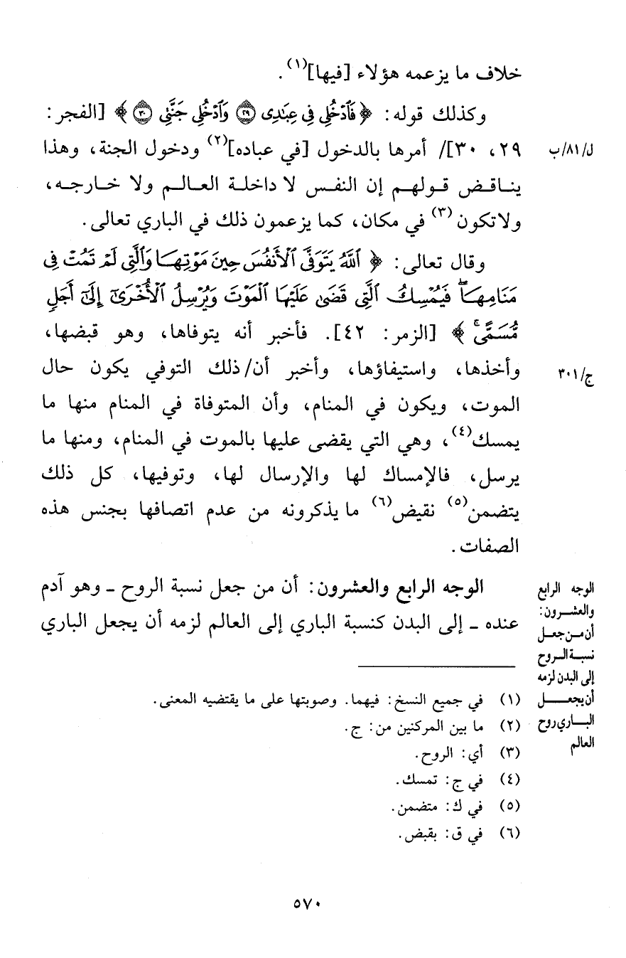 خلاف ما يزعمه هؤلاء فيها وكذلك قوله فَادْخُلِي فِي عِبَادِي (29) وَادْخُلِي جَنَّتِي (30) [الفجر 29-30] أمرها بالدخول في عباده ودخول الجنة وهذا يناقض قولهم إن النفس لا داخلة العالم ولا خارجه ولا تكون في مكان كما يزعمون ذلك في الباري تعالى وقال تعالى اللَّهُ يَتَوَفَّى الْأَنْفُسَ حِينَ مَوْتِهَا وَالَّتِي لَمْ تَمُتْ فِي مَنَامِهَا فَيُمْسِكُ الَّتِي قَضَى عَلَيْهَا الْمَوْتَ وَيُرْسِلُ الْأُخْرَى إِلَى أَجَلٍ مُسَمًّى [الزمر 42] فأخبر أنه يتوفاها وهو قبضها وأخذها واستيفاؤها وأخبر أن ذلك التوفي يكون حال الموت ويكون في المنام وأن المتوفاة في المنام منها ما يمسك وهي التي يقضى عليها بالموت في المنام ومنها ما يرسل فالإمساك لها والإرسال لها وتوفيها كل ذلك يتضمن نقيض ما يذكرونه من عدم اتصافها بجنس هذه الصفات الوجه الرابع والعشرون أن من جعل نسبة الروح وهو آدم عنده إلى البدن كنسبة الباري إلى العالم لزمه أن يجعل الباري