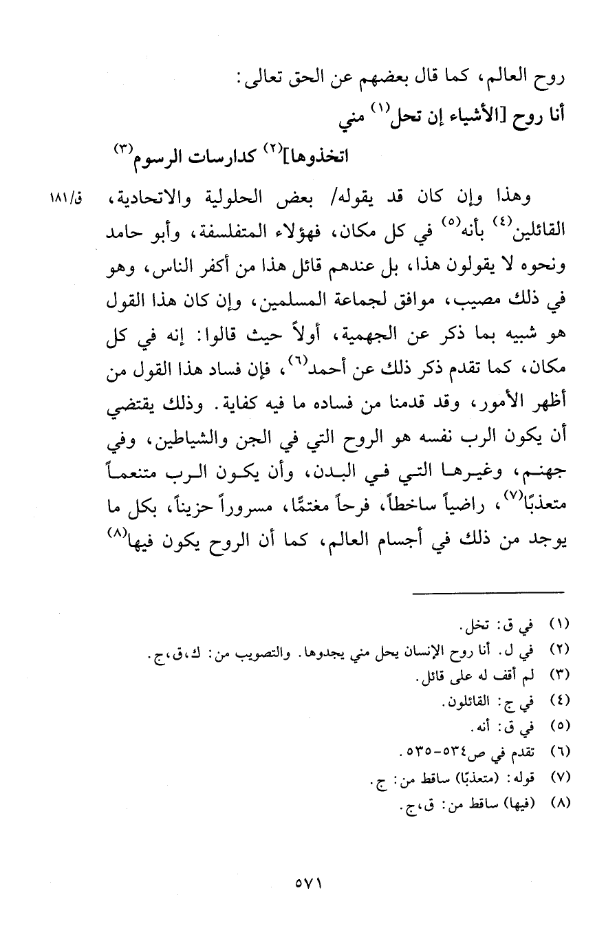 روح العالم كما قال بعضهم عن الحق تعالى أنا روح الأشياء إن تحل مني اتخذوها كدارسات الرسوم وهذا وإن كان قد يقوله يعض الحلولية والاتحادية القائلين بأنه في كل مكان فهؤلاء المتفلسفة وأبو حامد ونحوه لا يقولون هذا بل عندهم قائل هذا من أكفر الناس وهو في ذلك مصيب موافق لجماعة المسلمين وإن كان هذا القول هو شبيه بما ذكر عن الجهمية أولاً حيث قالوا إنه في كل مكان كما تقدم ذكر ذلك عن أحمد فإن فساد هذا القول من أظهر الأمور وقد قدمنا من فساده ما فيه كفاية وذلك يقتضي أن بكون الرب نفسه هو الروح التي في الجن والشياطين وفي جهنم وغيرها التي في البدن وأن يكون الرب متنعماً متعذبًا راضياً ساخطاً فرحاً مغتمًّا مسروراً حزيناً بكل ما يوجد من ذلك في أجسام العالم كما أن الروح يكون فيها