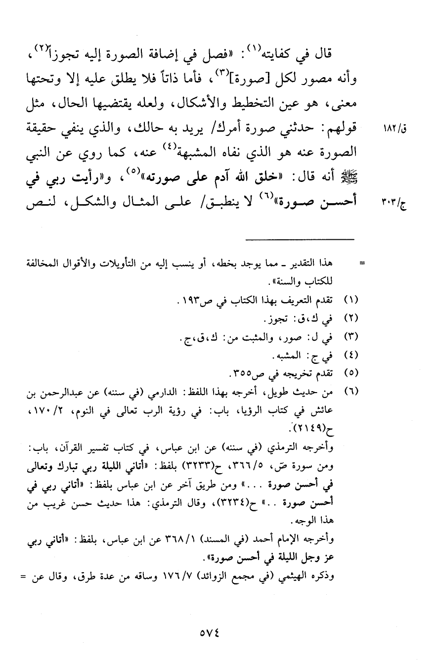 قال في كفايته فصل في إضافة الصورة إليه تجوزاً وأنه مصور لكل صورة فأما ذاتاً فلا يطلق عليه إلا وتحتها معنى هو عين التخطيط والأشكال ولعله يقتضيها الحال مثل قولهم حدثني صورة أمرك يريد به حالك والذي ينفي حقيقة الصورة عنه هو الذي نفاه المشبهة عنه كما روي عن النبي صلى الله عليه وسلم أنه قال خلق الله آدم على صورته ورأيت ربي في أحسن صورة لا ينطبق على المثال والشكل لنص