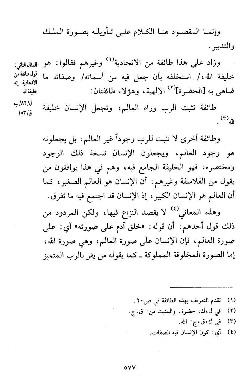 وإنما المقصود هنا الكلام على تأويله بصورة الملك والتدبير وزاد على هذا طائفة من الاتحادية وغيرهم فقالوا هو خليفة الله استخلفه بأن جعل فيه من أسمائه وصفاته ما ضاهى به الحضرة الإلهية وهؤلاء طائفتان طائفة تثبت الرب وراء العالم وتجعل الإنسان خليفة لله وطائفة أخرى لا تثبت للرب وجوداً غير العالم بل يجعلونه هو وجود العالم ويجعلون الإنسان نسخة ذلك الوجود ومختصره فهو الخليفة الجامع فيه وهم في هذا يوافقون من يقول من الفلاسفة وغيرهم أن الإنسان هو العالم الصغير كما أن العالم هو الإنسان الكبير إذ الإنسان قد اجتمع فيه ما تفرق وهذه المعاني لا يقصد النزاع فيها ولكن المردود من ذلك قول أحدهم أن قوله خلق آدم على صورته أي على صورة العالم فإن الإنسان على صورة العالم وهي صورة الله إما الصورة المخلوقة المملوكة كما يقوله من يقر بالرب المتميز