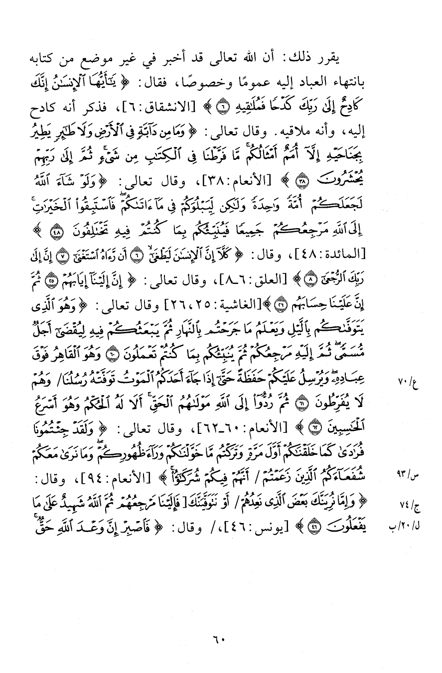 يقرر ذلك أن الله تعالى قد أخبر في غير موضع من كتابه بانتهاء العباد إليه عمومًا وخصوصًا فقال يَا أَيُّهَا الْإِنْسَانُ إِنَّكَ كَادِحٌ إِلَى رَبِّكَ كَدْحًا فَمُلَاقِيهِ (6) [الانشقاق 6] فذكر أنه كادح إليه وأنه ملاقيه وقال تعالى وَمَا مِنْ دَابَّةٍ فِي الْأَرْضِ وَلَا طَائِرٍ يَطِيرُ بِجَنَاحَيْهِ إِلَّا أُمَمٌ أَمْثَالُكُمْ مَا فَرَّطْنَا فِي الْكِتَابِ مِنْ شَيْءٍ ثُمَّ إِلَى رَبِّهِمْ يُحْشَرُونَ (38) [الأنعام 38] وقال تعالى وَلَوْ شَاءَ اللَّهُ لَجَعَلَكُمْ أُمَّةً وَاحِدَةً وَلَكِنْ لِيَبْلُوَكُمْ فِي مَا آتَاكُمْ فَاسْتَبِقُوا الْخَيْرَاتِ إِلَى اللَّهِ مَرْجِعُكُمْ جَمِيعًا فَيُنَبِّئُكُمْ بِمَا كُنْتُمْ فِيهِ تَخْتَلِفُونَ (48) [المائدة 48] وقال كَلَّا إِنَّ الْإِنْسَانَ لَيَطْغَى (6) أَنْ رَآهُ اسْتَغْنَى (7) إِنَّ إِلَى رَبِّكَ الرُّجْعَى (8) [العلق 6-8] وقال تعالى إِنَّ إِلَيْنَا إِيَابَهُمْ (25) ثُمَّ إِنَّ عَلَيْنَا حِسَابَهُمْ (26) [الغاشية 25-26] وقال تعالى وَهُوَ الَّذِي يَتَوَفَّاكُمْ بِاللَّيْلِ وَيَعْلَمُ مَا جَرَحْتُمْ بِالنَّهَارِ ثُمَّ يَبْعَثُكُمْ فِيهِ لِيُقْضَى أَجَلٌ مُسَمًّى ثُمَّ إِلَيْهِ مَرْجِعُكُمْ ثُمَّ يُنَبِّئُكُمْ بِمَا كُنْتُمْ تَعْمَلُونَ (60) وَهُوَ الْقَاهِرُ فَوْقَ عِبَادِهِ وَيُرْسِلُ عَلَيْكُمْ حَفَظَةً حَتَّى إِذَا جَاءَ أَحَدَكُمُ الْمَوْتُ تَوَفَّتْهُ رُسُلُنَا وَهُمْ لَا يُفَرِّطُونَ (61) ثُمَّ رُدُّوا إِلَى اللَّهِ مَوْلَاهُمُ الْحَقِّ أَلَا لَهُ الْحُكْمُ وَهُوَ أَسْرَعُ الْحَاسِبِينَ (62) [الأنعام 60-62] وقال تعالى وَلَقَدْ جِئْتُمُونَا فُرَادَى كَمَا خَلَقْنَاكُمْ أَوَّلَ مَرَّةٍ وَتَرَكْتُمْ مَا خَوَّلْنَاكُمْ وَرَاءَ ظُهُورِكُمْ وَمَا نَرَى مَعَكُمْ شُفَعَاءَكُمُ الَّذِينَ زَعَمْتُمْ أَنَّهُمْ فِيكُمْ شُرَكَاءُ [الأنعام 94] وقال وَإِمَّا نُرِيَنَّكَ بَعْضَ الَّذِي نَعِدُهُمْ أَوْ نَتَوَفَّيَنَّكَ فَإِلَيْنَا مَرْجِعُهُمْ ثُمَّ اللَّهُ شَهِيدٌ عَلَى مَا يَفْعَلُونَ (46) [يونس 46] وقال فَاصْبِرْ إِنَّ وَعْدَ اللَّهِ حَقٌّ
