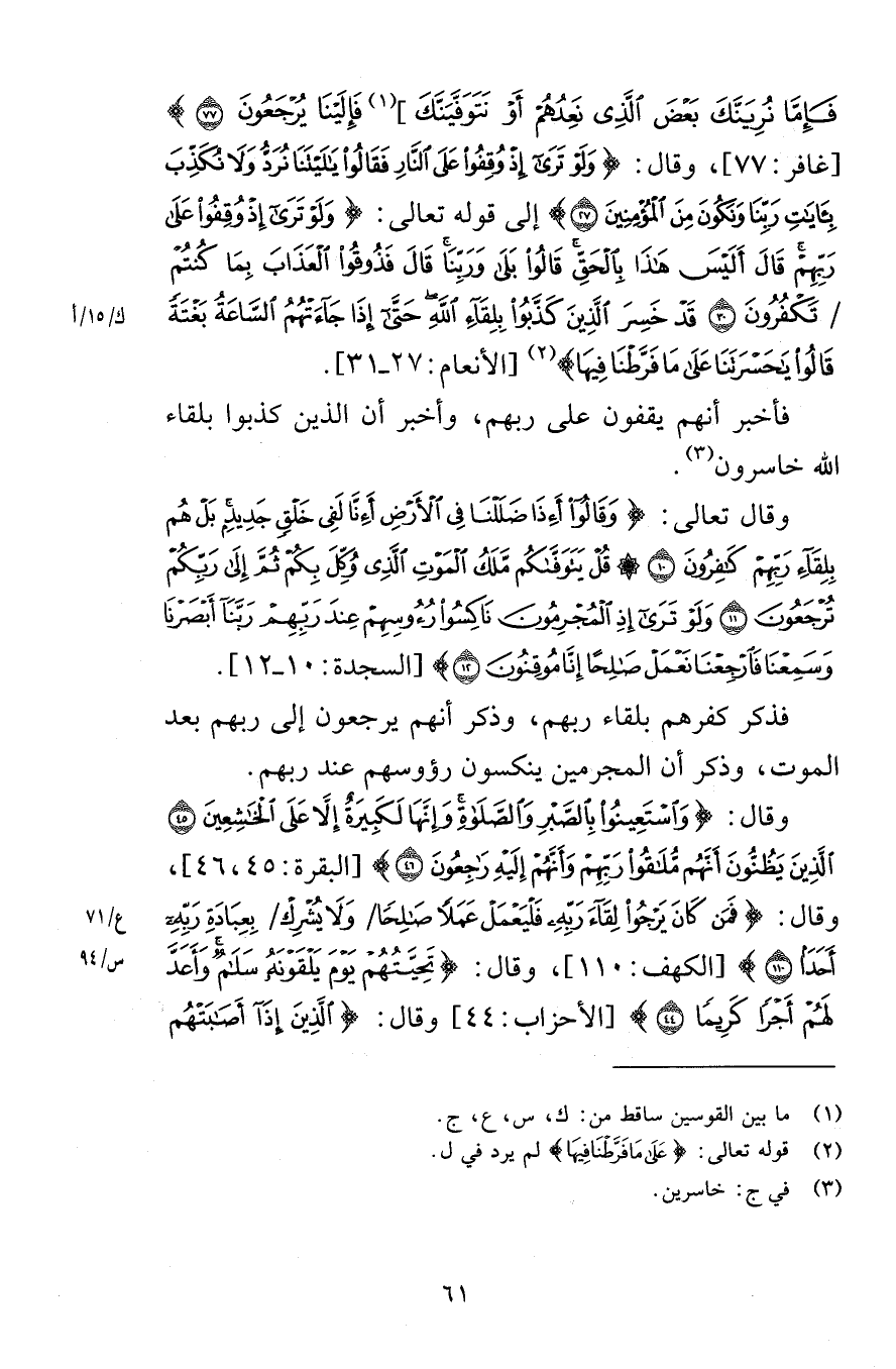فَإِمَّا نُرِيَنَّكَ بَعْضَ الَّذِي نَعِدُهُمْ أَوْ نَتَوَفَّيَنَّكَ فَإِلَيْنَا يُرْجَعُونَ (77) [غافر 77] وقال وَلَوْ تَرَى إِذْ وُقِفُوا عَلَى النَّارِ فَقَالُوا يَا لَيْتَنَا نُرَدُّ وَلَا نُكَذِّبَ بِآيَاتِ رَبِّنَا وَنَكُونَ مِنَ الْمُؤْمِنِينَ (27) إلى قوله تعالى وَلَوْ تَرَى إِذْ وُقِفُوا عَلَى رَبِّهِمْ قَالَ أَلَيْسَ هَذَا بِالْحَقِّ قَالُوا بَلَى وَرَبِّنَا قَالَ فَذُوقُوا الْعَذَابَ بِمَا كُنْتُمْ تَكْفُرُونَ (30) قَدْ خَسِرَ الَّذِينَ كَذَّبُوا بِلِقَاءِ اللَّهِ حَتَّى إِذَا جَاءَتْهُمُ السَّاعَةُ بَغْتَةً قَالُوا يَا حَسْرَتَنَا عَلَى مَا فَرَّطْنَا فِيهَا [الأنعام 27-31] فأخبر أنهم يقفون على ربهم وأخبر أن الذين كذبوا بلقاء الله خاسرون وقال تعالى وَقَالُوا أَإِذَا ضَلَلْنَا فِي الْأَرْضِ أَإِنَّا لَفِي خَلْقٍ جَدِيدٍ بَلْ هُمْ بِلِقَاءِ رَبِّهِمْ كَافِرُونَ (10) قُلْ يَتَوَفَّاكُمْ مَلَكُ الْمَوْتِ الَّذِي وُكِّلَ بِكُمْ ثُمَّ إِلَى رَبِّكُمْ تُرْجَعُونَ (11) وَلَوْ تَرَى إِذِ الْمُجْرِمُونَ نَاكِسُو رُءُوسِهِمْ عِنْدَ رَبِّهِمْ رَبَّنَا أَبْصَرْنَا وَسَمِعْنَا فَارْجِعْنَا نَعْمَلْ صَالِحًا إِنَّا مُوقِنُونَ (12) [السجدة 10-12] فذكر كفرهم بلقاء ربهم وذكر أنهم يرجعون إلى ربهم بعد الموت وذكر أن المجرمين ينكسون رؤوسهم عند ربهم وقال وَاسْتَعِينُوا بِالصَّبْرِ وَالصَّلَاةِ وَإِنَّهَا لَكَبِيرَةٌ إِلَّا عَلَى الْخَاشِعِينَ (45) الَّذِينَ يَظُنُّونَ أَنَّهُمْ مُلَاقُو رَبِّهِمْ وَأَنَّهُمْ إِلَيْهِ رَاجِعُونَ (46) [البقرة 45-46] وقال فَمَنْ كَانَ يَرْجُو لِقَاءَ رَبِّهِ فَلْيَعْمَلْ عَمَلًا صَالِحًا وَلَا يُشْرِكْ بِعِبَادَةِ رَبِّهِ أَحَدًا (110) [الكهف 110] وقال تَحِيَّتُهُمْ يَوْمَ يَلْقَوْنَهُ سَلَامٌ وَأَعَدَّ لَهُمْ أَجْرًا كَرِيمًا (44) [الأحزاب 44] وقال الَّذِينَ إِذَا أَصَابَتْهُمْ