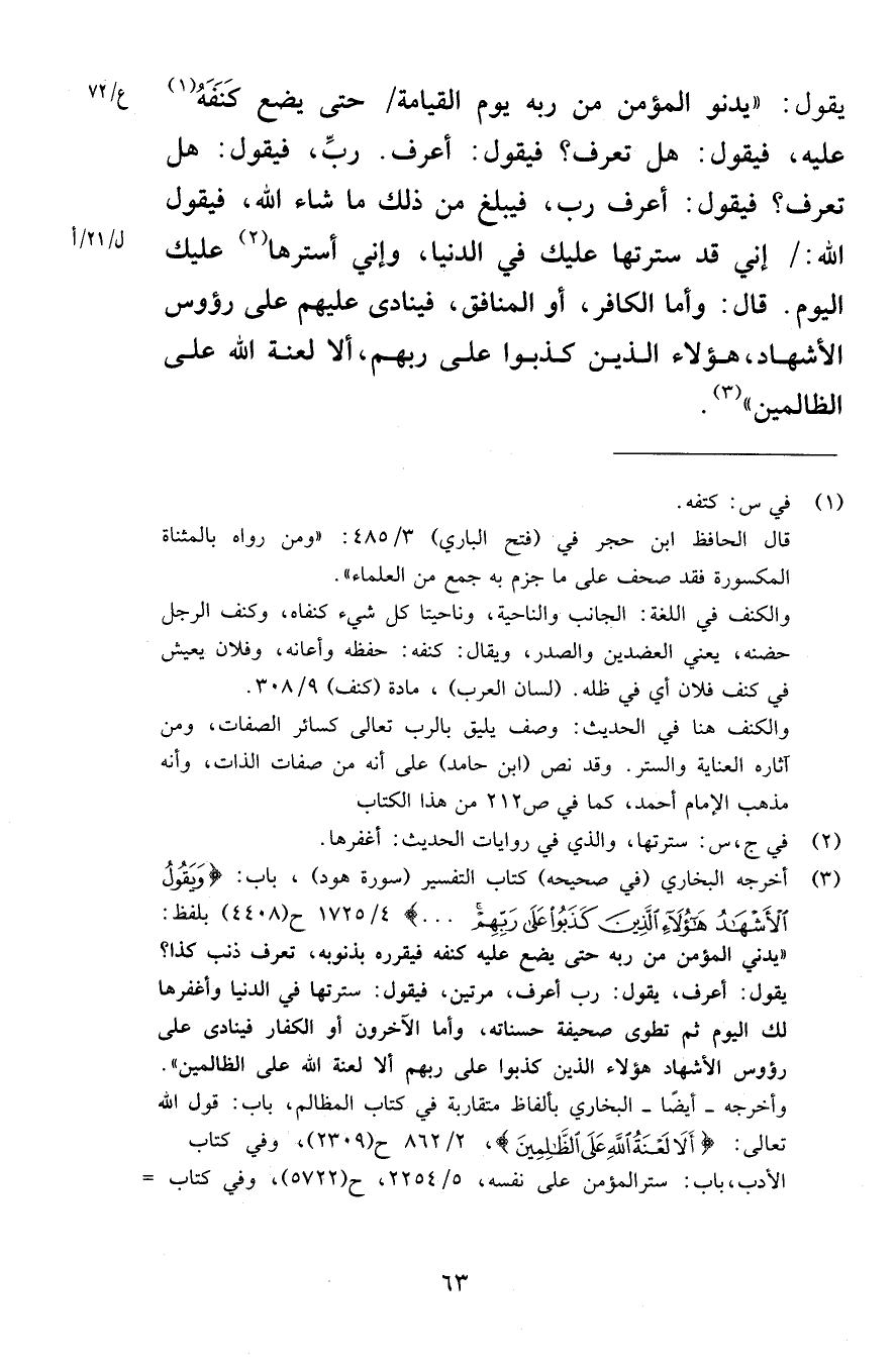 يقول يدنو المؤمن من ربه يوم القيامة حتى يضع كَنَفَهُ عليه فيقول هل تعرف فيقول أعرف ربِّ فيقول هل تعرف فيقول أعرف رب فيبلغ من ذلك ما شاء الله فيقول الله إني قد سترتها عليك في الدنيا وإني أسترها عليك اليوم قال وأما الكافر أو المنافق فينادى عليهم على رؤوس الأشهاد هؤلاء الذين كذبوا على ربهم ألا لعنة الله على الظالمين