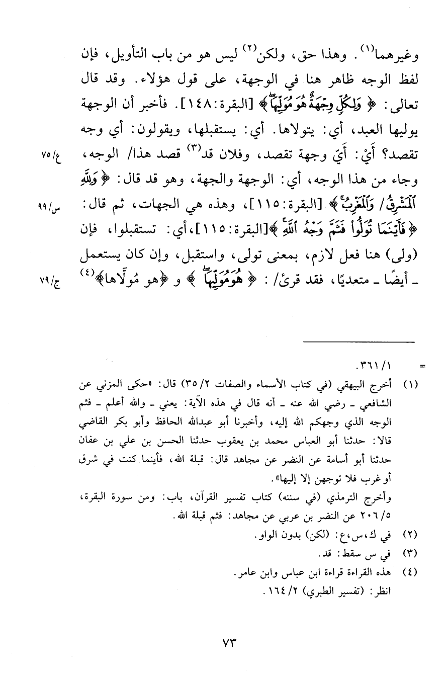 وغيرهما وهذا حق ولكن ليس هو من باب التأويل فإن لفظ الوجه ظاهر هنا في الوجهة على قول هؤلاء وقد قال تعالى وَلِكُلٍّ وِجْهَةٌ هُوَ مُوَلِّيهَا [البقرة 148] فأخبر أن الوجهة يوليها العبد أي يتولاها أي يستقبلها ويقولون أي وجه تقصد أَيْ أَيّ وجهة تقصد وفلان قد قصد هذا الوجه وجاء من هذا الوجه أي الوجهة والجهة وهو قد قال وَلِلَّهِ الْمَشْرِقُ وَالْمَغْرِبُ [البقرة 115] وهذه هي الجهات ثم قال فَأَيْنَمَا تُوَلُّوا فَثَمَّ وَجْهُ اللَّهِ [البقرة 115] أي تستقبلوا فإن ولى هنا فعل لازم بمعنى تولى واستقبل وإن كان يستعمل أيضًا متعديًا فقد قرئ هُوَ مُوَلِّيهَا وهو مُولَّاها