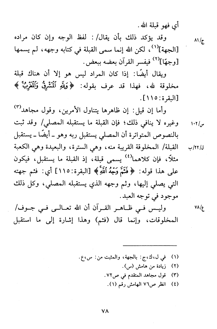 أي فهو قبلة الله وقد يؤكد ذلك بأن يقال لفظ الوجه وإن كان مراده الجهة لكن الله إنما سمى القبلة في كتابه وجهه لم يسمها وجهًا فيفسر القرآن بعضه ببعض ويقال أيضًا إذا كان المراد ليس هو إلا أن هناك قبلة مخلوقة لله فهذا قد عرف بقوله وَلِلَّهِ الْمَشْرِقُ وَالْمَغْرِبُ [البقرة 115] وأما إن قيل إن ظاهرها يتناول الأمرين وقول مجاهد وغيره لا ينافي ذلك فإن القبلة ما يستقبله المصلي وقد ثبت بالنصوص المتواترة أن المصلي يستقبل ربه وهو أيضًا يستقبل القبلة المخلوقة القريبة منه وهي السترة والبعيدة عنه وهي الكعبة مثلاً فإن كلاهما يسمى قبلة إذ القبلة ما يستقبل فيكون على هذا قوله فَثَمَّ وَجْهُ اللَّهِ [البقرة 115] أي فثم جهته التي يصلي إليها وثم وجهه الذي يستقبله المصلي وكل ذلك موجود في توجه العبد وليس في ظاهر القرآن أن الله تعالى في جوف المخلوقات وإنما قال فثم وهذا إشارة إلى ما استقبل