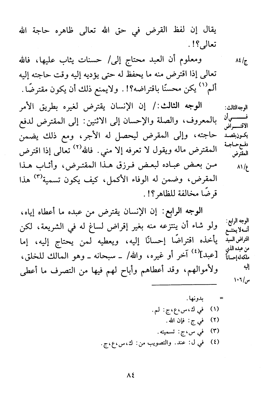 يقال إن لفظ القرض في حق الله تعالى ظاهره حاجة الله تعالى ومعلوم أن العبد محتاج إلى حسنات يثاب عليها فالله تعالى إذا اقترض منه ما يحفظ له حتى يؤديه إليه وقت حاجته إليه ألم يكن محسنًا باقتراضه ولايمنع ذلك أن يكون مقترضًا الوجه الثالث أن الإنسان يقترض لغيره بطريق الأمر بالمعروف والصلة والإحسان إلى الاثنين إلى المقترض لدفع حاجته وإلى المقرض ليحصل له الأجر ومع ذلك يضمن المقترض ماله ويقول لا تعرفه إلا مني فالله تعالى إذا اقترض من بعض عباده لبعض فرزق هذا المقترض وأثاب هذا المقرض وضمن له الوفاء الأكمل كيف يكون تسميته هذا قرضًا مخالفة للظاهر الوجه الرابع أن الإنسان يقترض من عبده ما أعطاه إياه ولو شاء أن ينتزعه منه بغير إقراض لساغ له في الشريعة لكن يأخذه اقتراضًا إحسانًا إليه ويعطيه لمن يحتاج إليه إما عبد آخر أو غيره والله سبحانه وهو المالك للخلق ولأموالهم وقد أعطاهم وأباح لهم فيها من التصرف ما أعطى