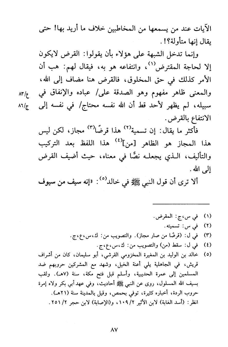 الآيات عند من يسمعها من المخاطبين خلاف ما أريد بها حتى يقال إنها متأولة وإنما تدخل الشبهة على هؤلاء بأن يقولوا القرض لايكون إلا لحاجة المقترض وانتفاعه هو به فيقال لهم هب أن الأمر كذلك في حق المخلوق فالقرض هنا مضاف إلى الله والمعنى ظاهر مفهوم وهو الصدقة على عباده والإنفاق في سبيله لم يظهر لأحد قط أن الله نفسه محتاج في نفسه إلى الانتفاع بالقرض فأكثر ما يقال إن تسمية هذا قرضًا مجاز لكن ليس هذا المجاز هو الظاهر من هذا اللفظ بعد التركيب والتأليف الذي يجعله نصًّا في معناه حيث أضيف القرض إلى الله ألا ترى أن قول النبي صلى الله عليه وسلم في خالد إنه سيف من سيوف