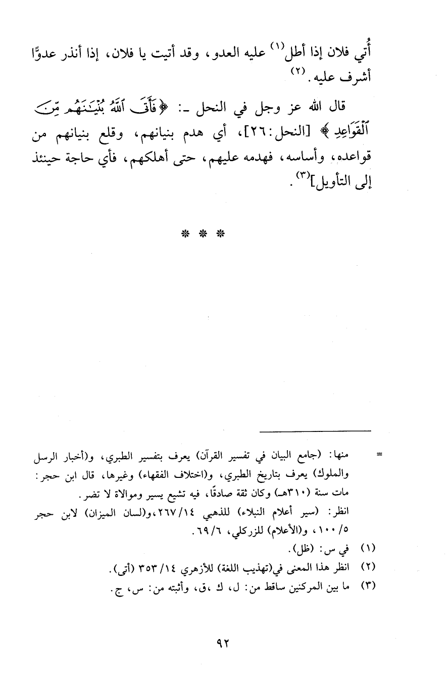 أُتي فلان إذا أطل عليه العدو وقد أتيت يا فلان إذا أنذر عدوًّا أشرف عليه قال الله عز وجل في النحل فَأَتَى اللَّهُ بُنْيَانَهُمْ مِنَ الْقَوَاعِدِ [النحل 26] أي هدم بنيانهم وقلع بنيانهم من قواعده وأساسه فهدمه عليهم حتى أهلكهم فأي حاجة حينئذ إلى التأويل