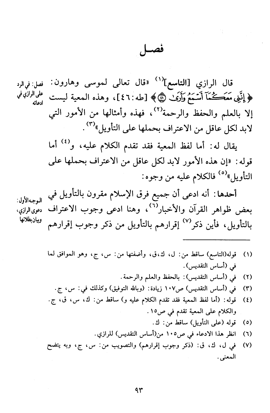 فصل قال الرازي التاسع قال تعالى لموسى وهارون إِنَّنِي مَعَكُمَا أَسْمَعُ وَأَرَى (46) [طه 46] وهذه المعية ليست إلا بالعلم والحفظ والرحمة فهذه وأمثالها من الأمور التي لابد لكل عاقل من الاعتراف بحملها على التأويل يقال له أما لفظ المعية فقد تقدم الكلام عليه وأما قوله إن هذه الأمور لابد لكل عاقل من الاعتراف بحملها على التأويل فالكلام عليه من وجوه أحدها أنه ادعى أن جميع فرق الإسلام مقرون بالتأويل في بعض ظواهر القرآن والأخبار وهنا ادعى وجوب الاعتراف بالتأويل فأين ذكر إقرارهم بالتأويل من ذكر وجوب إقرارهم