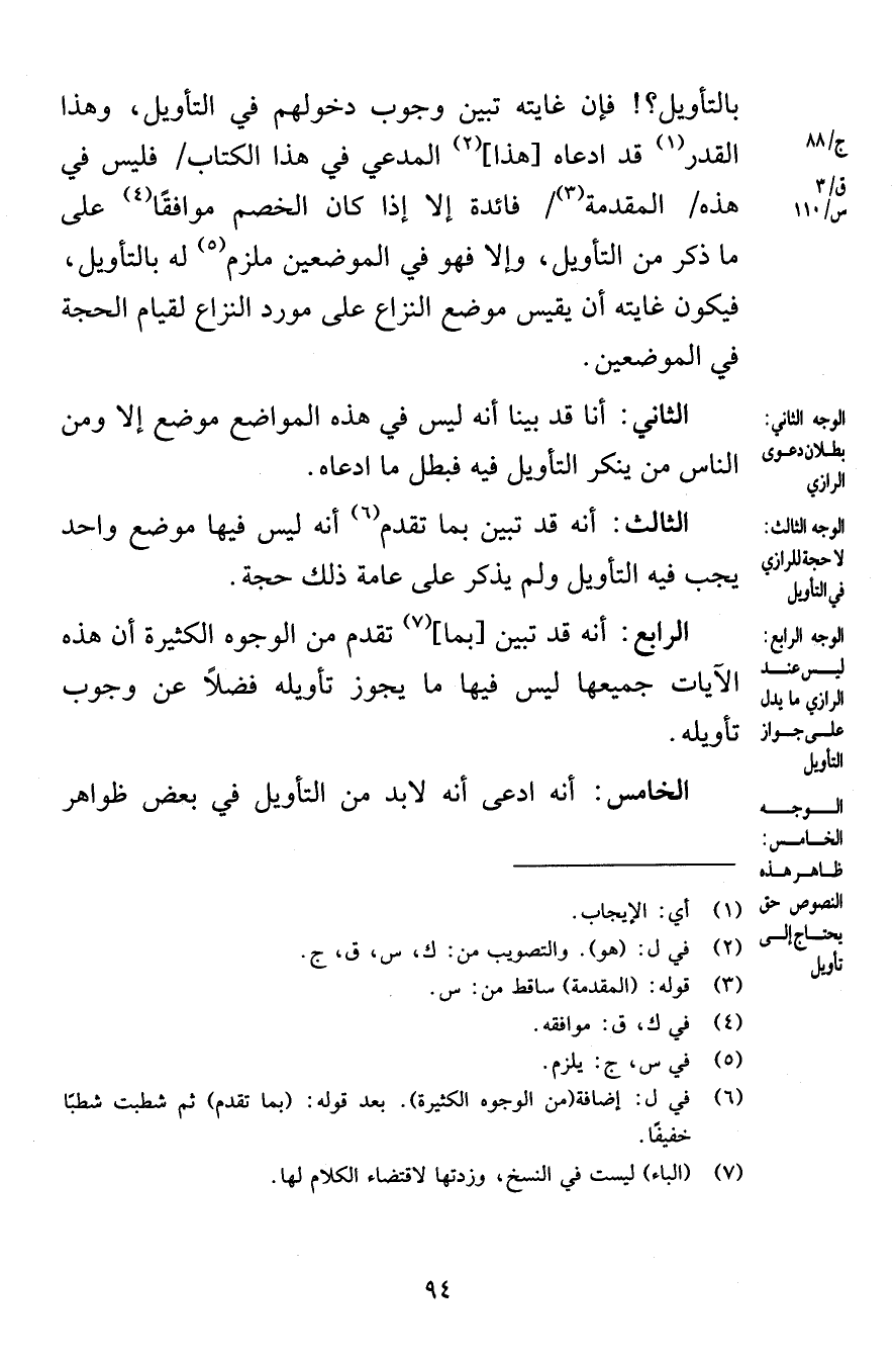 بالتأويل فإن غايته تبين وجوب دخولهم في التأويل وهذا القدر قد ادعاه هذا المدعي في هذا الكتاب فليس في هذه المقدمة فائدة إلا إذا كان الخصم موافقًا على ما ذكر من التأويل وإلا فهو في الموضعين ملزم له بالتأويل فيكون غايته أن يقيس موضع النزاع على مورد النزاع لقيام الحجة في الموضعين الثاني أنا قد بينا أنه ليس في هذه المواضع موضع إلا ومن الناس من ينكر التأويل فيه فبطل ما ادعاه الثالث أنه قد تبين بما تقدم أنه ليس فيها موضع واحد يجب فيه التأويل ولم يذكر على عامة ذلك حجة الرابع أنه قد تبين بما تقدم من الوجوه الكثيرة أن هذه الآيات جميعها ليس فيها ما يجوز تأويله فضلاً عن وجوب تأويله الخامس أنه ادعى أنه لابد من التأويل في بعض ظواهر