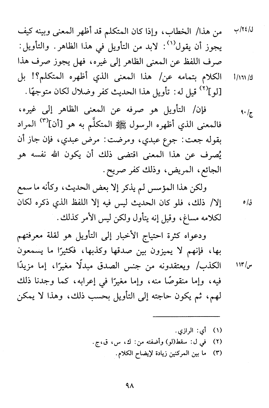من هذا الخطاب وإذا كان المتكلم قد أظهر المعنى وبينه كيف يجوز أن يقول لابد من التأويل في الظاهر والتأويل صرف اللفظ عن المعنى الظاهر إلى غيره فهل يجوز صرف هذا الكلام بتمامه عن هذا المعنى الذي أظهره المتكلم بل لو قيل له تأويل هذا الحديث كفر وضلال لكان متوجهًا فإن التأويل هو صرفه عن المعنى الظاهر إلى غيره فالمعنى الذي أظهره الرسول صلى الله عليه وسلم المتكلَّم به هو أن المراد بقول جعت جوع عبدي ومرضت مرض عبدي فإن جاز أن يُصرف عن هذا المعنى اقتضى ذلك أن يكون الله نفسه هو الجائع المريض وذلك كفر صريح ولكن هذا المؤسس لم يذكر إلا بعض الحديث وكأنه ما سمع إلا ذلك فلو كان الحديث ليس فيه إلا اللفظ الذي ذكره لكان لكلامه مساغ وقيل إنه يتأول ولكن ليس الأمر كذلك ودعواه كثرة احتياج الأخبار إلى التأويل هو لقلة معرفتهم بها فإنهم لا يميزون بين صدقها وكذبها فكثيرًا ما يسمعون الكذب ويعتقدونه من جنس الصدق مبدلاً مغيرًا إما مزيدًا فيه وإما منقوصًا منه وإما مغيرًا في إعرابه كما وجدنا ذلك لهم ثم يكون حاجته إلى التأويل بحسب ذلك وهذا لا يمكن