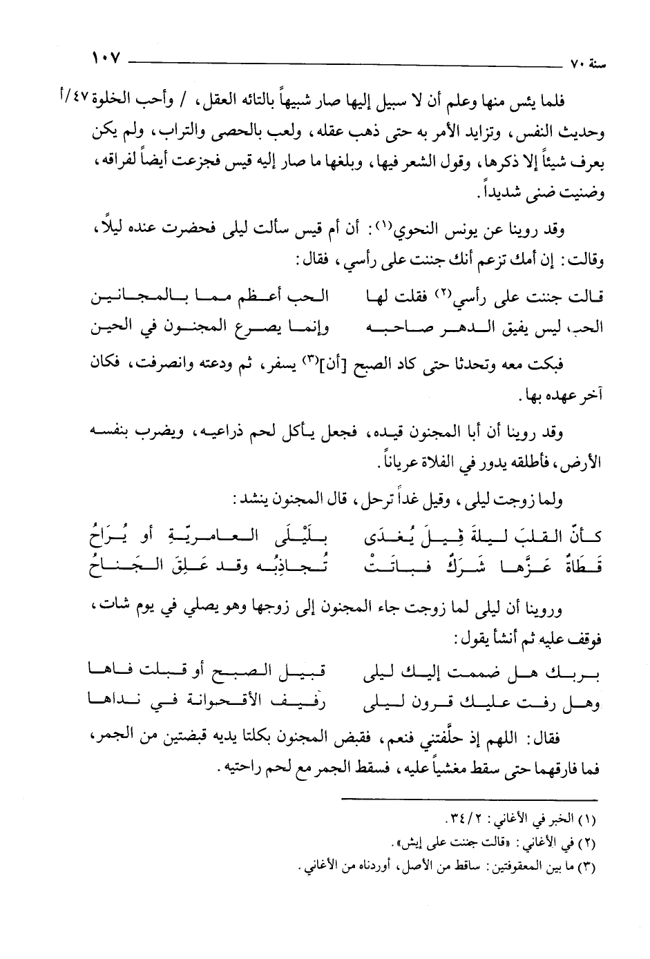 وقد روينا عن يونس النحوي [1] : أن أم قيس سألت ليلى فحضرت عنده ليلا، وقالت: إن أمك تزعم أنك جننت على رأسي، فقال: