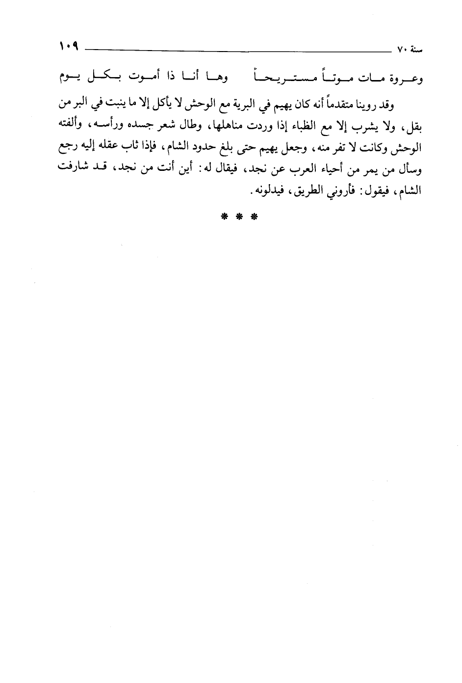وقد روينا متقدما أنه كان يهيم في البرية مع الوحش لا يأكل إلا ما ينبت في البر من بقل، ولا يشرب إلا مع الظباء إذا وردت مناهلها، وطال شعر جسده ورأسه، وألفته الوحش وكانت لا تفر منه، وجعل يهيم حتى بلغ حدود الشام، فإذا ثاب عقله إليه رجع وسأل من يمر من أحياء العرب عن نجد، فيقال له: أين أنت من نجد، قد شارفت الشام، فيقول: فأروني الطريق، فيدلونه.