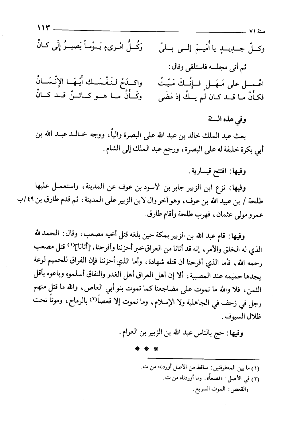 وفيها: قام عبد الله بن الزبير بمكة حين بلغه قتل أخيه مصعب، وقال: الحمد للَّه الذي له الخلق والأمر، إنه قد أتانا من العراق خبر أحزننا، وأفرحنا، [أتانا] [1] قتل مصعب رحمه الله، فأما الذي أفرحنا أن قتله شهادة، وأما الذي أحزننا فإن الفراق للحميم لوعة يجدها حميمه عند المصيبة، ألا إن أهل العراق أهل الغدر والنفاق أسلموه وباعوه بأقل الثمن، فلا والله ما نموت على مضاجعنا كما تموت بنو أبي العاص، والله ما قتل منهم رجل في زحف في الجاهلية ولا الإسلام، وما نموت إلا قعصا [2] بالرماح، وموتا نحت ظلال السيوف.