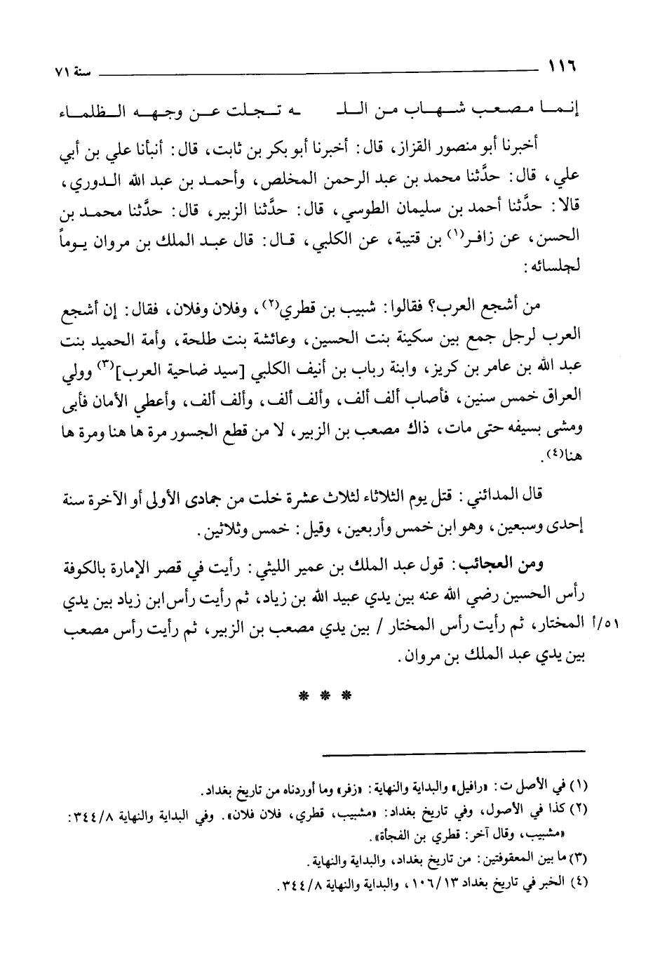 ومن العجائب: قول عبد الملك بن عمير الليثي: رأيت في قصر الإمارة بالكوفة رأس الحسين رضي الله عنه بين يدي عبيد الله بن زياد، ثم رأيت رأس ابن زياد بين يدي المختار، ثم رأيت رأس المختار/ بين يدي مصعب بن الزبير، ثم رأيت رأس مصعب بين يدي عبد الملك بن مروان.