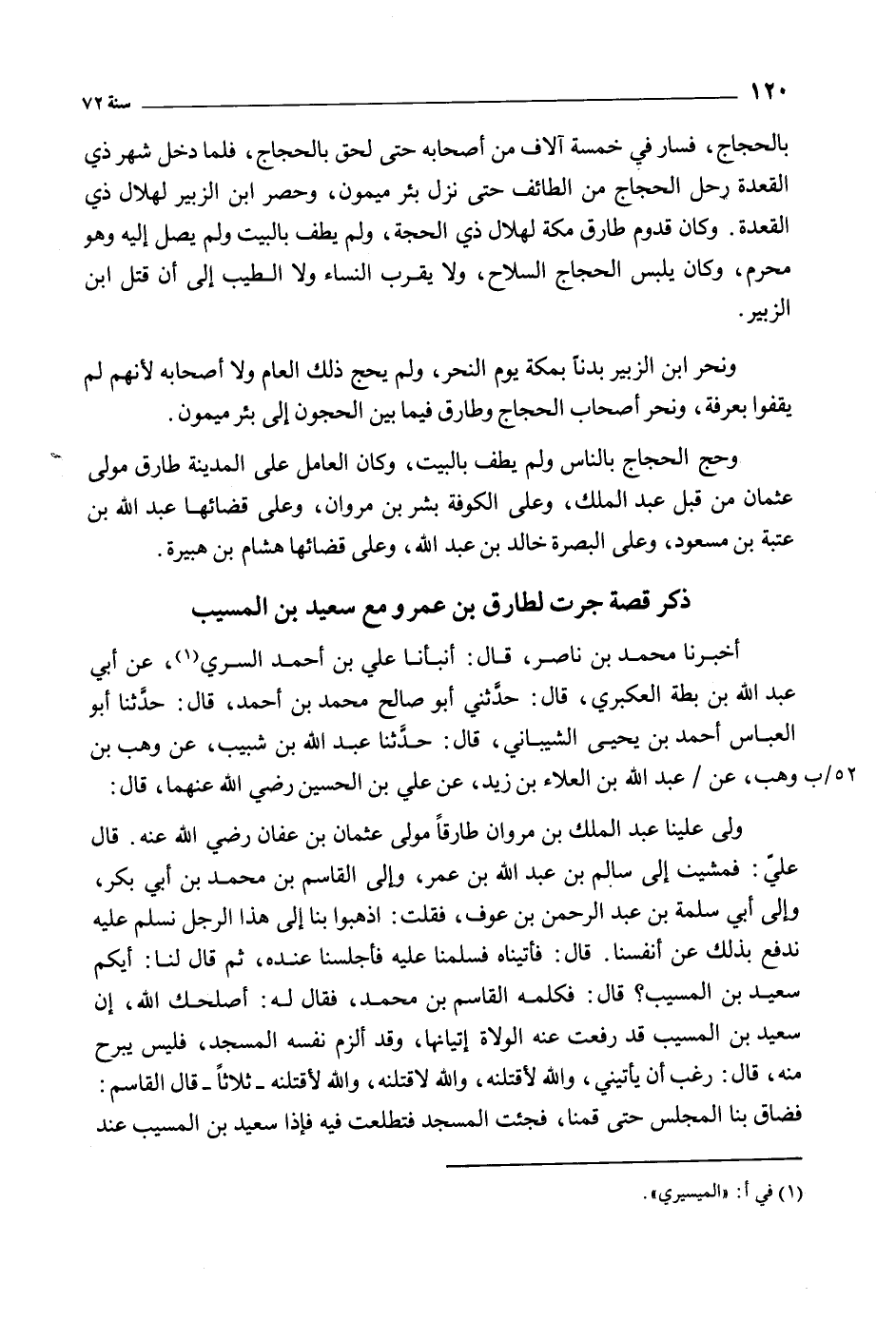 أخبرنا محمد بن ناصر، قال: أنبأنا علي بْنُ أَحْمَدَ السَّرِيُّ [1] ، عَنْ أَبِي عَبْدِ اللَّهِ بْن بطة العكبري، قال: حدثني أبو صالح مُحَمَّدُ بْنُ أَحْمَدَ، قَالَ: حَدَّثَنَا أَبُو الْعَبَّاسِ أَحْمَدُ بْنُ يَحْيَى الشَّيْبَانِيُّ، قَالَ: حَدَّثَنَا عَبْدُ اللَّهِ بْنُ شَبِيبٍ، عَنْ وَهْبِ بْنِ وَهْبٍ، عَنْ/ عَبْدِ اللَّهِ بْنِ الْعَلاءِ بْنِ زَيْدٍ، عَنْ عَلِيِّ بْنِ الْحُسَيْنِ رَضِيَ اللَّهُ عَنْهُمَا، قَالَ: وَلَّى عَلَيْنَا عَبْدُ الْمَلِكِ بْنُ مَرْوَانَ طَارِقًا مَوْلَى عُثْمَانَ بْنِ عَفَّانَ رَضِيَ اللَّهُ عنه. قال عليّ: فمشيت إِلَى سَالِمِ بْنِ عَبْدِ اللَّهِ بْنِ عُمَرَ، وَإِلَى الْقَاسِمِ بْنِ مُحَمَّدِ بْنِ أَبِي بَكْرٍ، وَإِلَى أَبِي سَلَمَةَ بْنِ عَبْدِ الرَّحَمْنِ بْنِ عَوْفٍ، فَقُلْتُ: اذْهَبُوا بِنَا إِلَى هَذَا الرَّجُلِ نسلم عليه ندفع بذلك عن أنفسنا. قال: فَأَتَيْنَاهُ فَسَلَّمْنَا عَلَيْهِ فَأَجْلَسَنَا عِنْدَهُ، ثُمّ قَالَ لَنَا: أَيُّكُمْ سَعِيدُ بْنُ الْمُسَيِّبِ؟ قَالَ: فَكَلَّمَهُ الْقَاسِمُ بْنُ مُحَمَّدٍ، فَقَالَ لَهُ: أَصْلَحَكَ اللَّهُ، إِنَّ سَعِيدَ بْنَ الْمُسَيِّبِ قَدْ رَفَعَتْ عَنْهُ الولاة إتيانها، وَقَدْ أَلْزَمَ نَفْسَهُ الْمَسْجِدَ، فَلَيْسَ يَبْرَحُ مِنْهُ، قَالَ: رَغِبَ أَنْ يَأْتِيَنِي، وَاللَّهِ لأَقْتُلَنَّهُ، وَاللَّهِ لأَقْتُلَنَّهُ، وَاللَّهِ لأَقْتُلَنَّهُ- ثَلاثًا- قَالَ الْقَاسِمُ:
