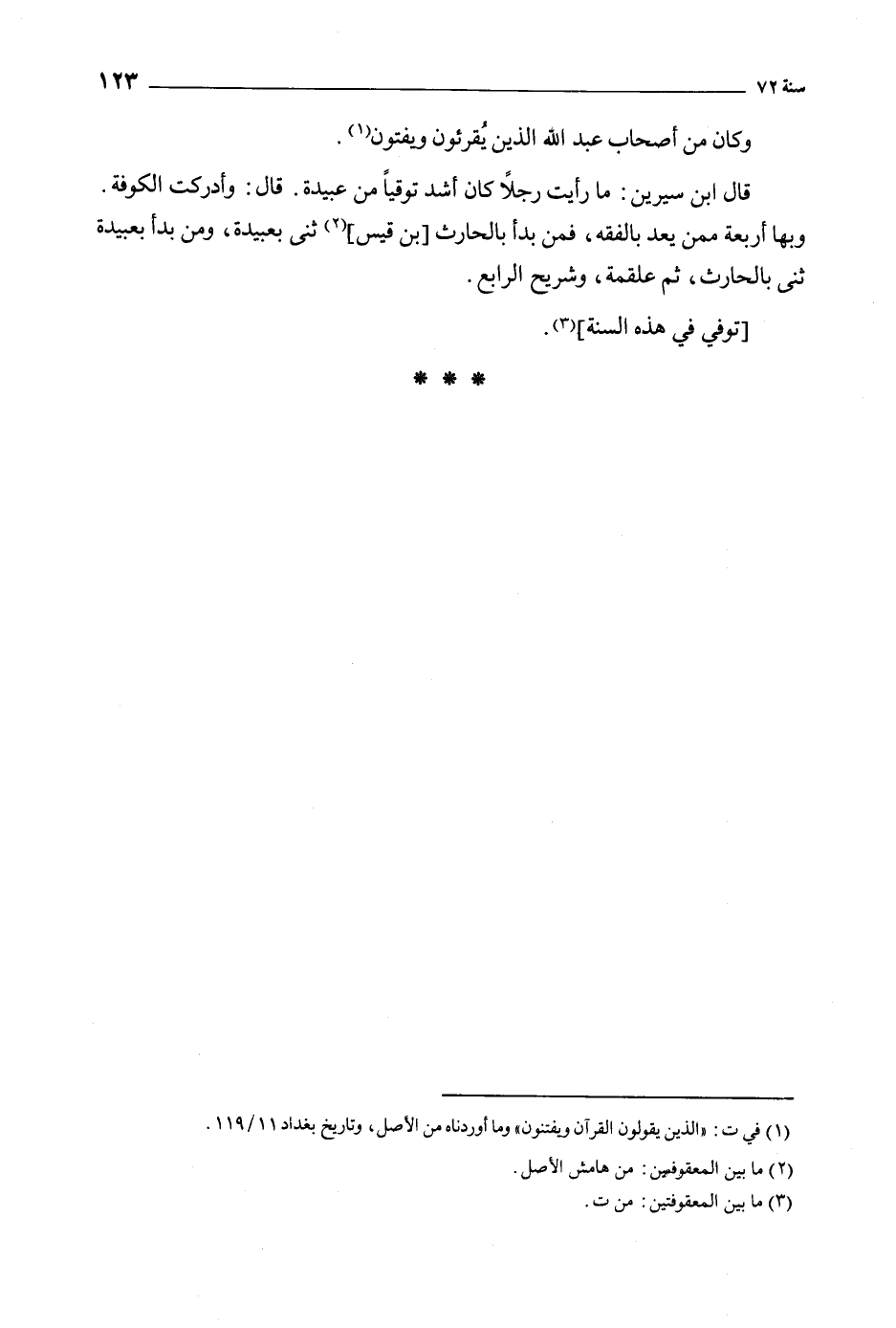 قال ابن سيرين: ما رأيت رجلا كان أشد توقيا من عبيدة. قال: وأدركت الكوفة.