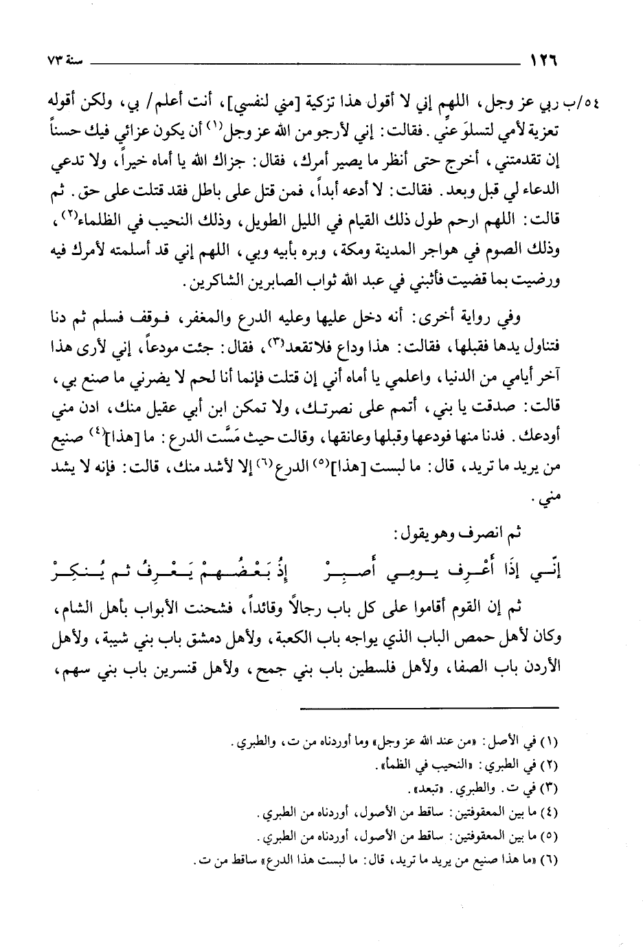 ربي عز وجل، اللَّهمّ إني لا أقول هذا تزكية [مني لنفسي] ، أنت أعلم/ بي، ولكن أقوله تعزية لأمي لتسلو عني. فقالت: إني لأرجو من الله عز وجل [1] أن يكون عزائي فيك حسنا إن تقدمتني، أخرج حتى أنظر ما يصير أمرك، فقال: جزاك الله يا أماه خيرا، ولا تدعي الدعاء لي قبل وبعد. فقالت: لا أدعه أبدا، فمن قتل على باطل فقد قتلت على حق. ثم قالت: اللَّهمّ ارحم طول ذلك القيام في الليل الطويل، وذلك النحيب في الظلماء [2] ، وذلك الصوم في هواجر المدينة ومكة، وبره بأبيه وبي، اللَّهمّ إني قد أسلمته لأمرك فيه ورضيت بما قضيت فأثبني في عبد الله ثواب الصابرين الشاكرين.