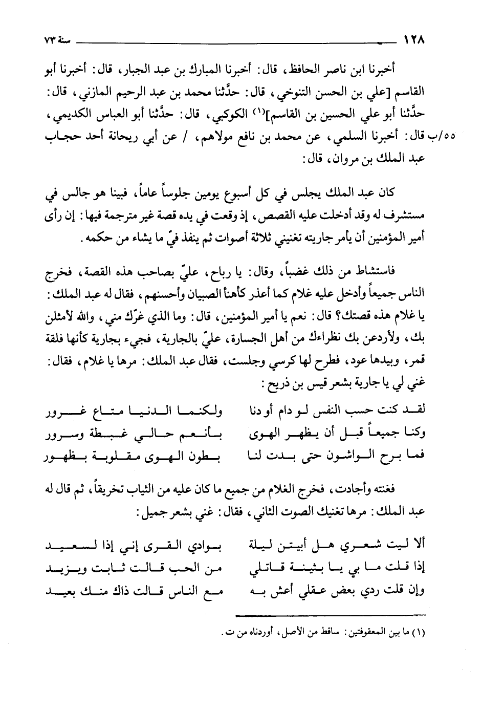 حَدَّثَنَا أَبُو علي الحسين بْن القَاسِم] [1] الكوكبي، قَالَ: حدثنا أبو العباس الكديمي، قال: أخبرنا السلمي، عن محمد بن نافع مولاهم، / عن أبي ريحانة أحد حجاب عبد الملك بن مروان، قال: